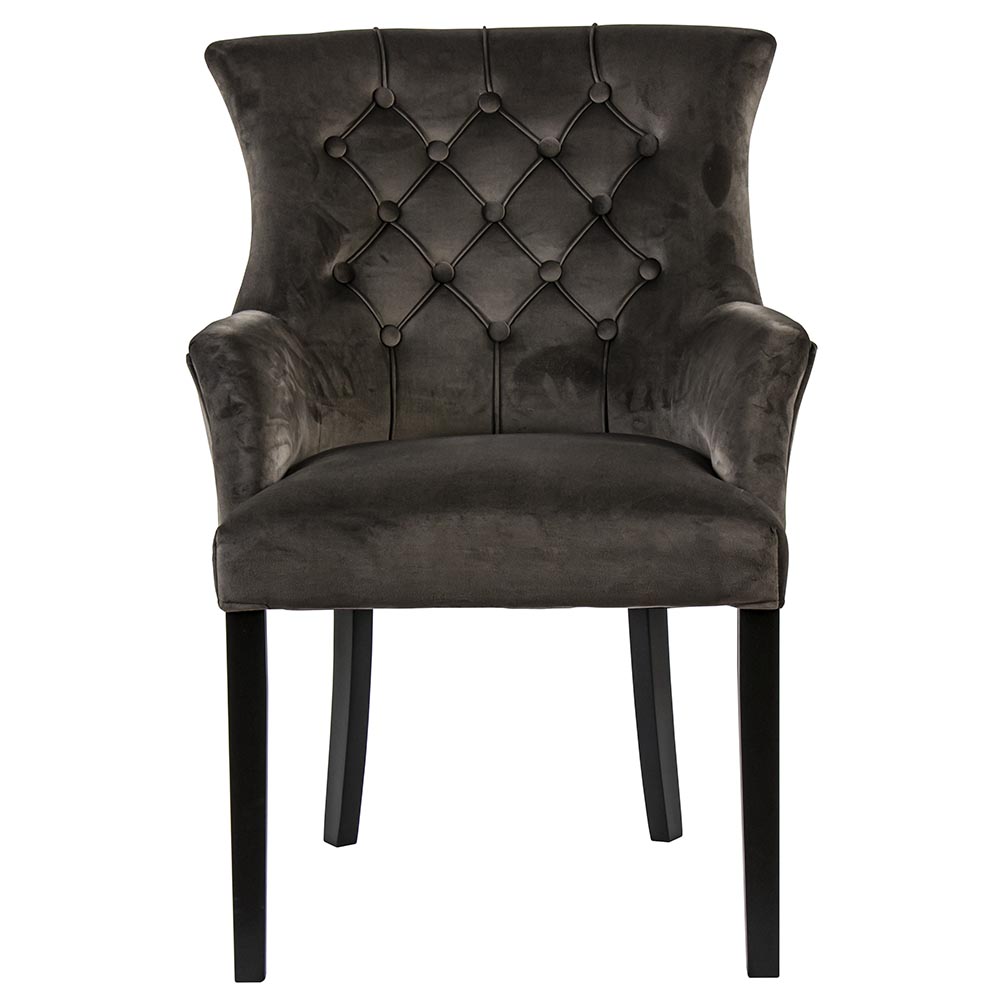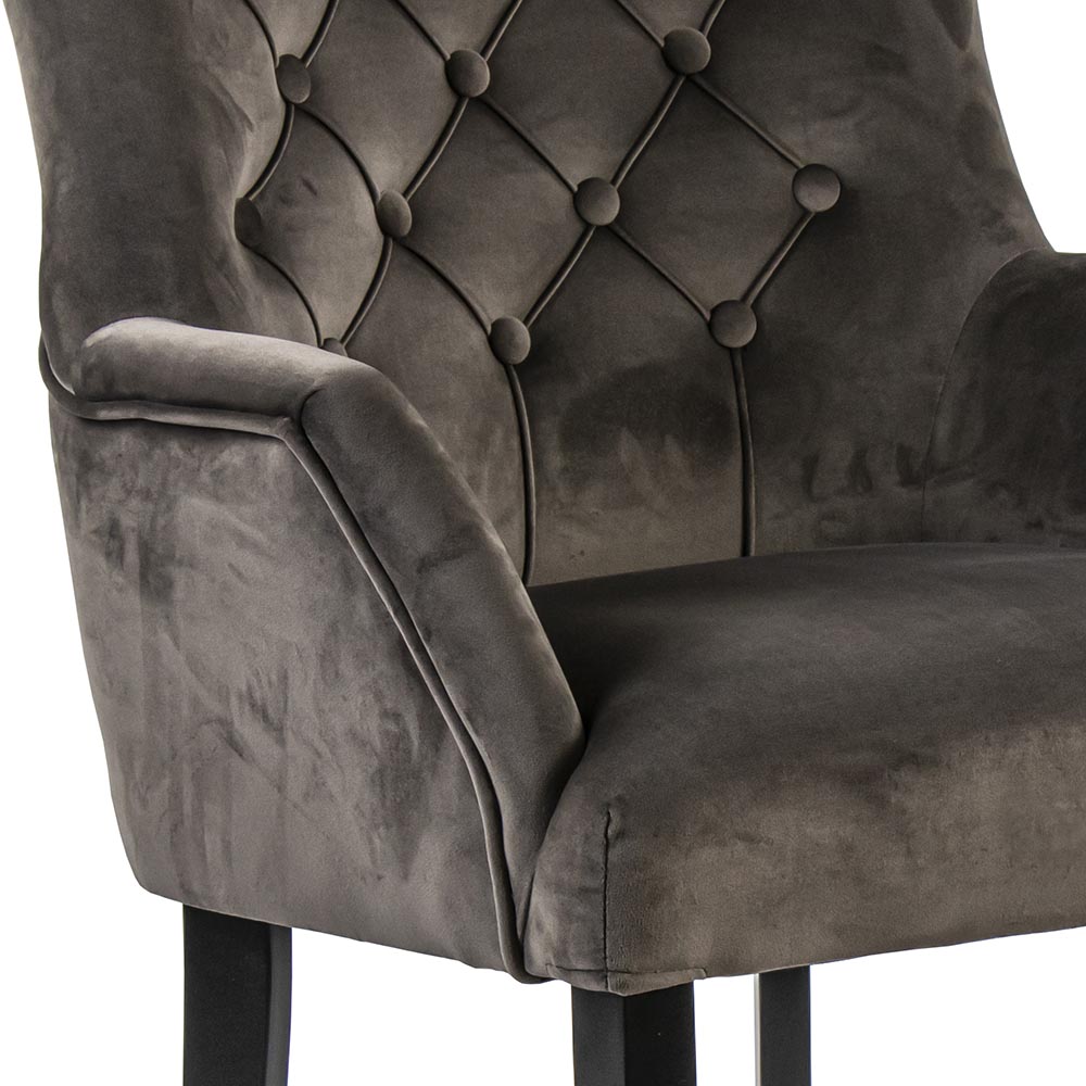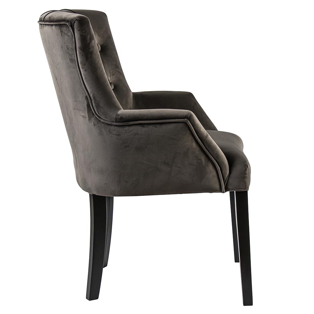 Met deze comfortabele armstoel wordt dineren een waar genot. De eetkamerstoel heeft een hoog zitcomfort en biedt door de hoge rugleuning en de armleuning veel ondersteuning. De zitting is uitgevoerd in stof in een velourse kwaliteit en is mooi gecombineerd met een zwarte houten poot. De rugleuning is aan de binnenzijde gecapitonneerd wat de stoel een chique klassieke uitstraling geeft.