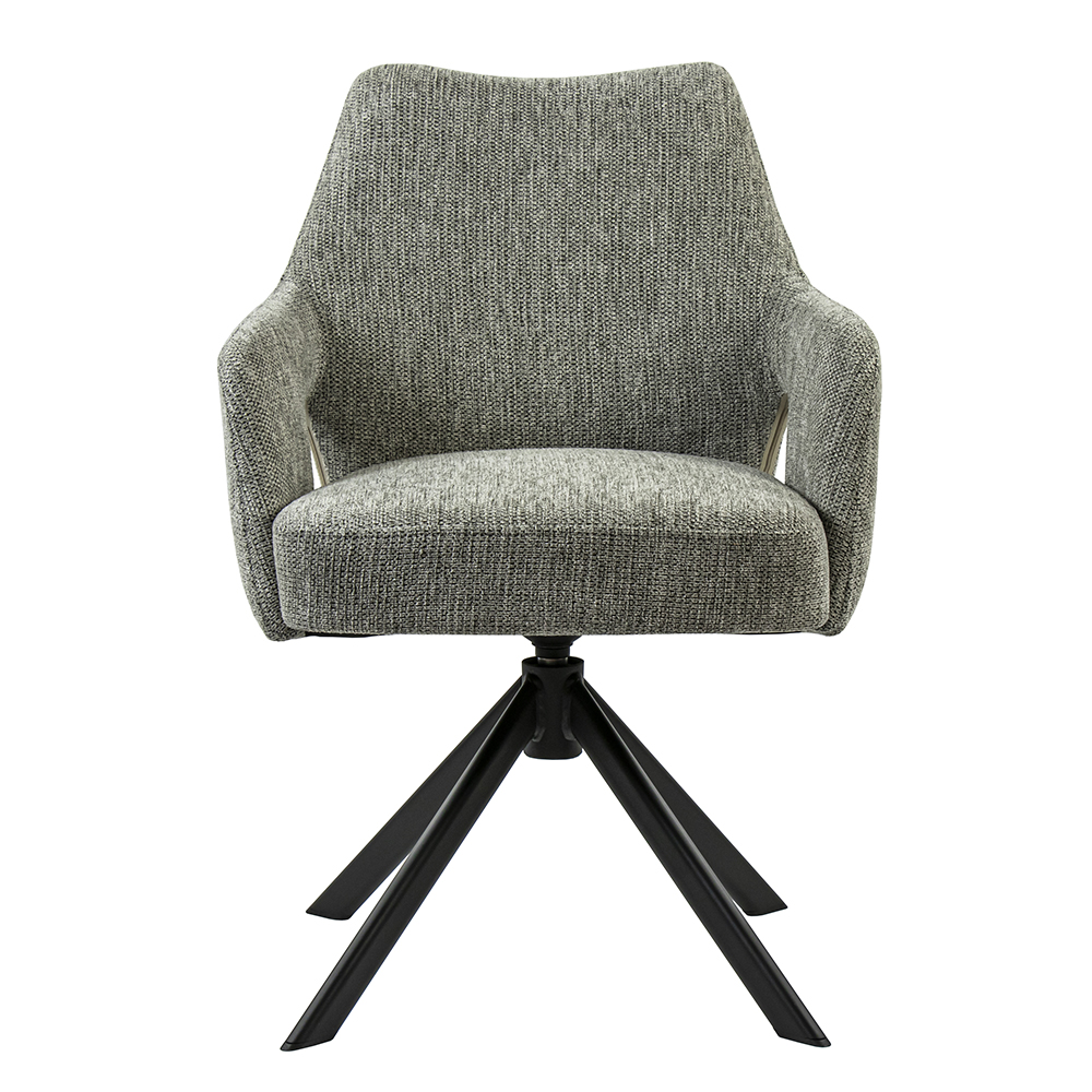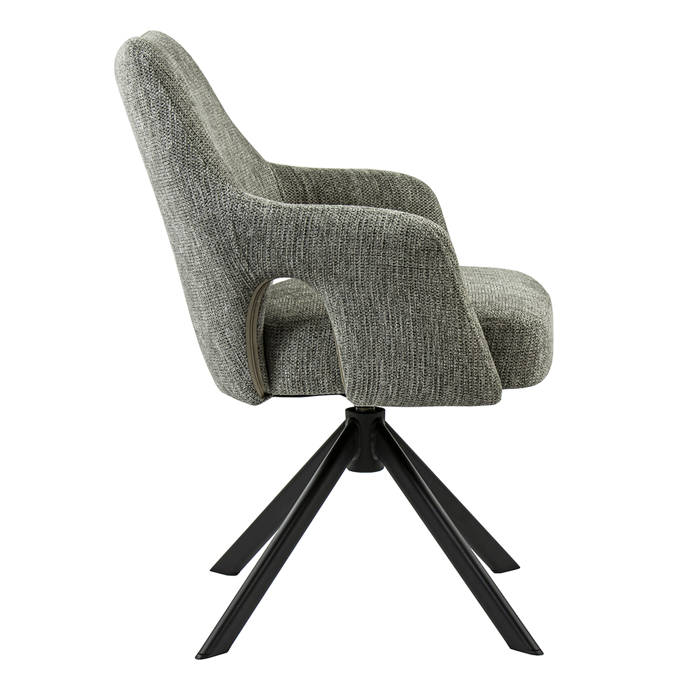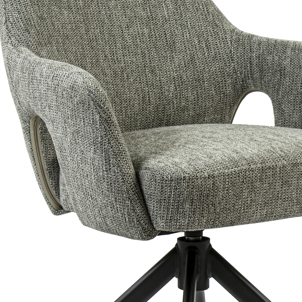 Deze comfortabele eetkamerstoel maakt dineren en borrelen een waar genot. De armstoel heeft een zachte stoffen zitting met een hoge rugleuning en armleuningen voor extra support. De stoel is draaibaar en voorzien van een return-system zodat de stoel automatisch weer terug draait. De stof heeft een grove structuur en is uitgevoerd in het grijs.