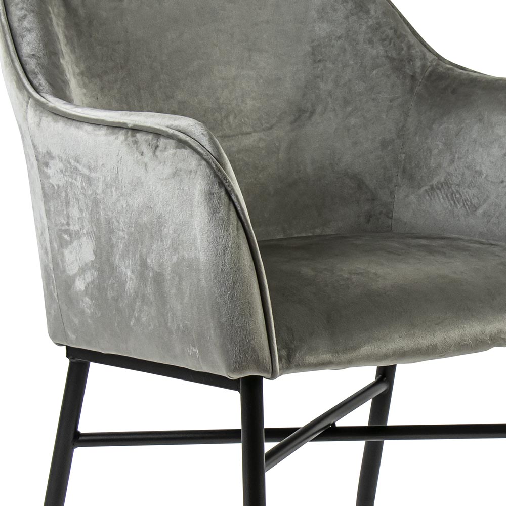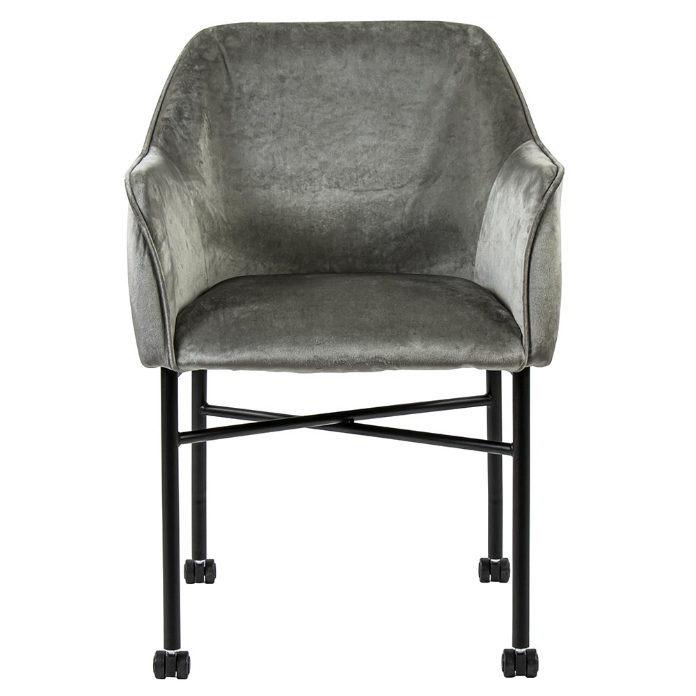 Heerlijk dineren en natafelen in deze eetkamerstoel is een waar genot. De armstoel heeft een comfortabele zitting die door de armleuning extra steun biedt. De kuip is volledig gemaakt van stof en uitgevoerd in het velours grijs. Het comfort van de trendy eetkamerstoel wordt vergroot door de wieltjes onderop de poot waardoor u gemakkelijk kunt aanschuiven. De poot is gemaakt van metaal en voorzien van een mat zwarte finish.