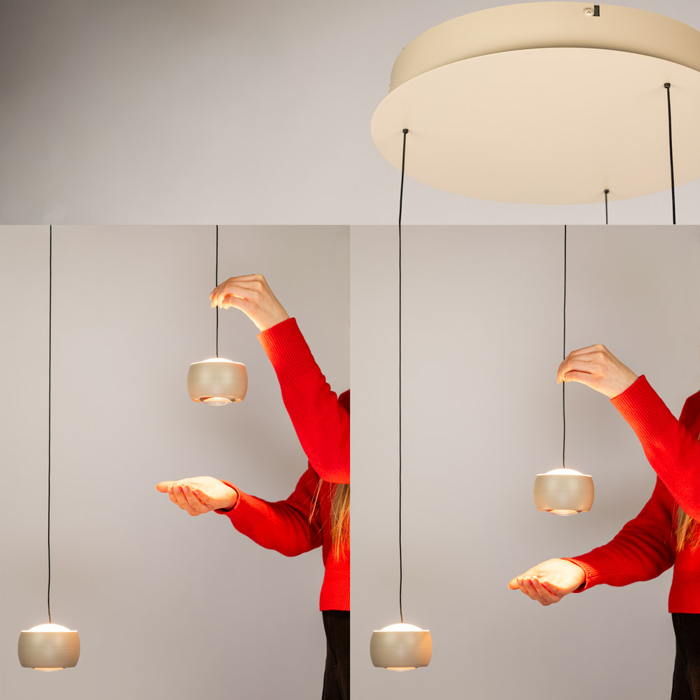 Highlights • 3-lichts ronde hanglamp met geïntegreerde LED • Dim-to-warm voor maximale sfeervariatie • Direct licht naar beneden, diffuus licht omhoog • Easy-lift systeem voor speels hoogteverschil • Aansluitbaar op wanddimmer (niet inbegrepen)