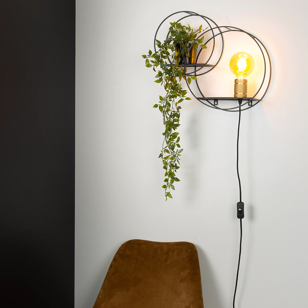 Deze leuke wandlamp en wandrek ineen is een perfecte toevoeging aan het interieur. Leuk voor in de hal of de woonkamer om net even een donkere plek te verlichten. Daarnaast bieden de plankjes ruimte voor leuke accessoires of plantjes. De wandlamp is gemaakt van metaal en uitgevoerd in het zwart. Leuk detail is de gouden E27 fitting op het onderste plankje. De wandlamp is voorzien van een snoer met schakelaar met een lengte van 100 cm.