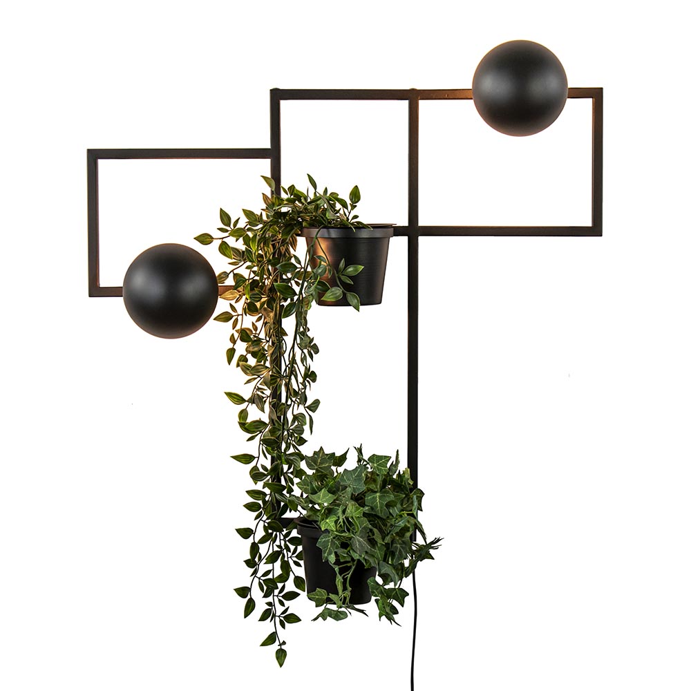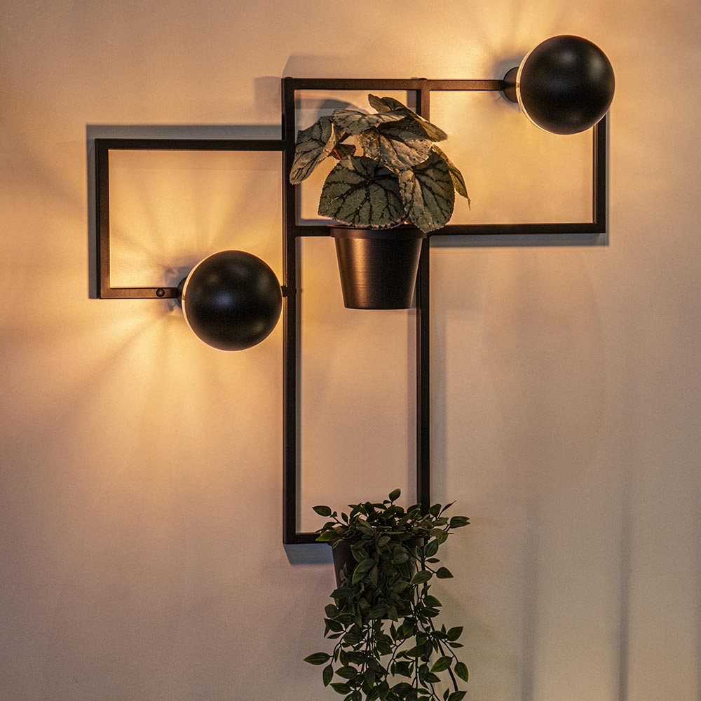 Deze decoratieve wandlamp zorgt niet alleen voor licht maar ook voor groen in huis. De wandlamp bestaat uit een metalen frame dat in het zwart is uitgevoerd. Over het frame zijn 2 lichtpunten en 2 plantenpotten verdeeld. De mat zwarte potten zijn inclusief en bieden ruimte voor leuke kleine planten. Het frame is voorzien van een zwart snoer met een lengte van 140 cm en een knipschakelaar op 50 cm. Ideaal voor in een hal, woonkamer of zelfs de slaapkamer. De sfeervolle wandlamp is mooi toe te pasen in een botanische, industriële of landelijke woonstijl.