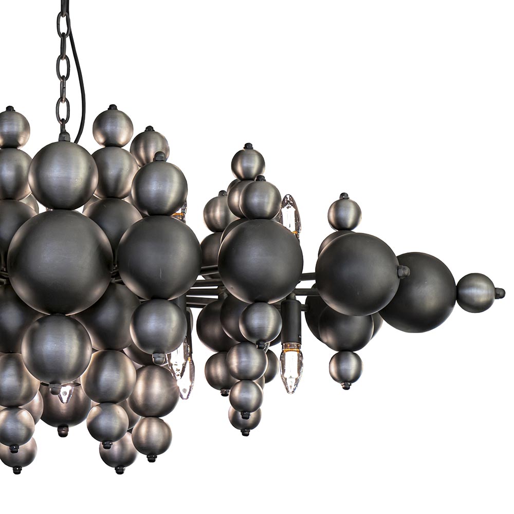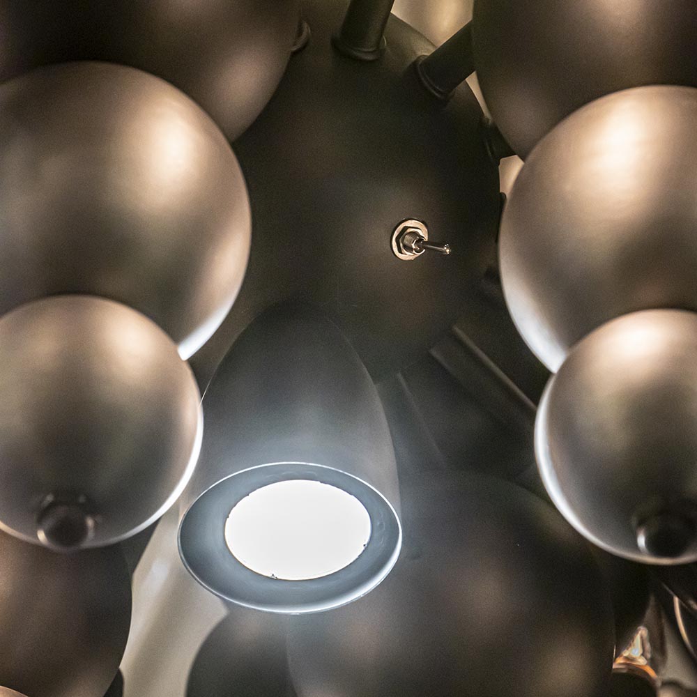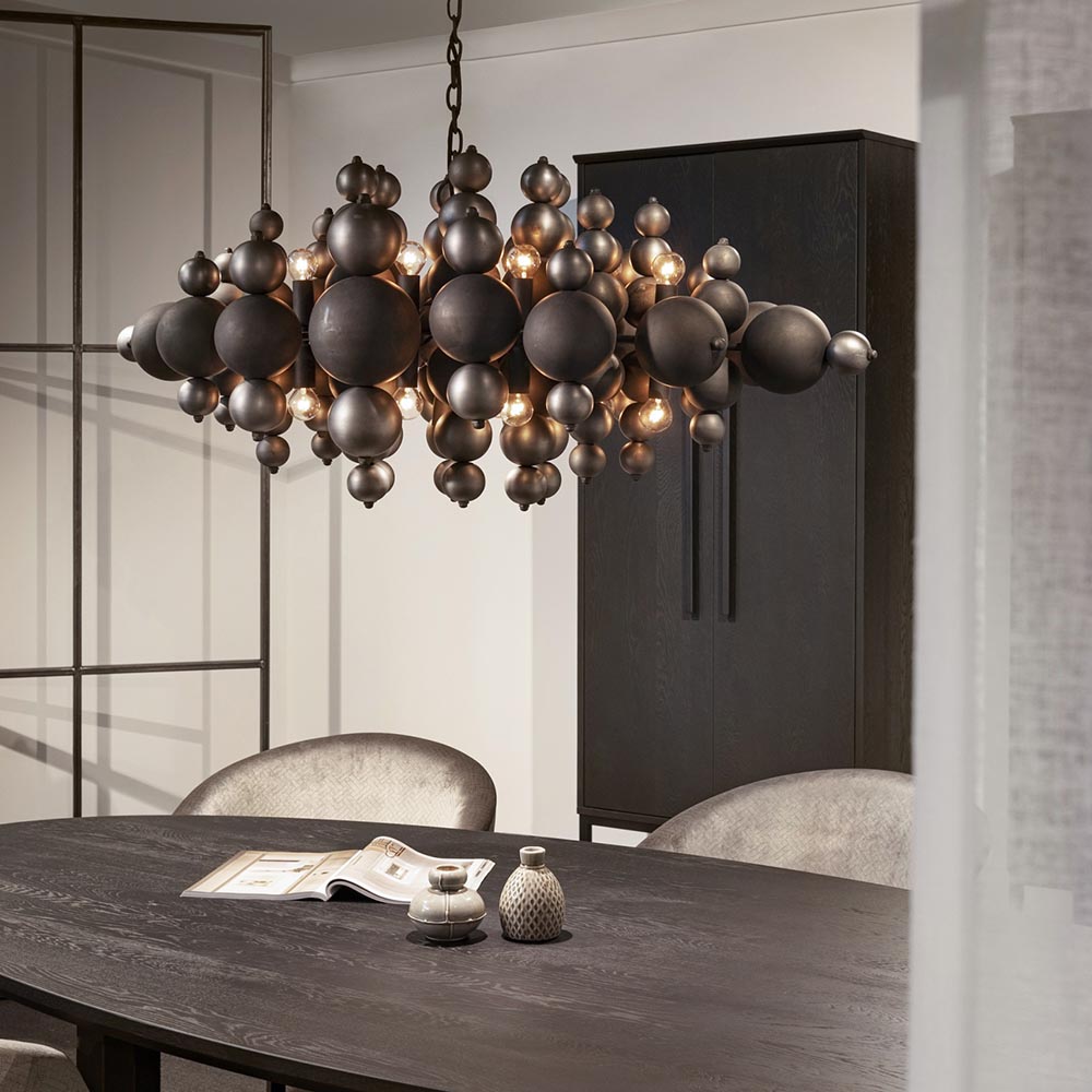 Deze prachtige lamp is door z’n design meer dan alleen verlichting, het is als ware een kunstobject in huis. Hanglamp Blow is volledig gemaakt van metaal en uitgevoerd in het industrieel grijs met antraciet. De grote hanglamp is ovaal van vorm en samengesteld uit allerlei metalen bollen in diverse afmetingen. Door de metalen uitvoering krijgt de hanglamp een robuuste en toch luxe uitstraling die mooi is toe te passen in diverse woonstijlen. De ovale hanglamp is voorzien van 16x E14 lichtpunten die over het armatuur zijn verspreid. Deze zorgen voor een sfeervolle verlichting in de ruimte. Daarnaast is er onderop het armatuur ook een GU10 spot verwerkt die goed het oppervlak onder de lamp kan verlichting. Deze spot is ook apart te bedienen dmv de schakelaar op het armatuur. Hanglamp Blow is een prachtige toevoeging boven een grote ovale eettafel of past mooi in een vide of kantoor/vergaderuimte. Deze lamp is meer dan alleen een lamp, het is een ware eye-cather.