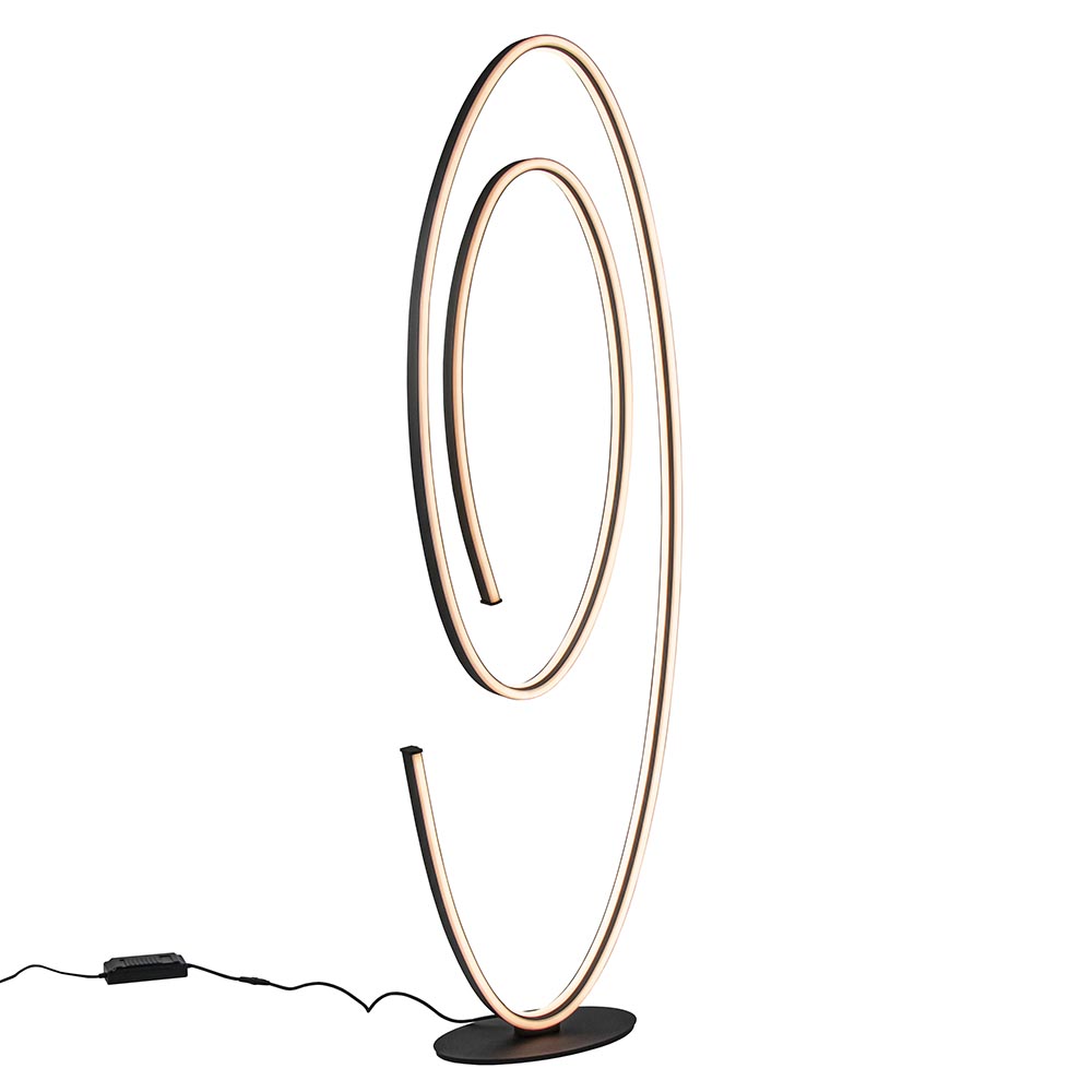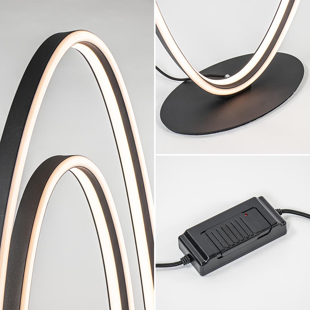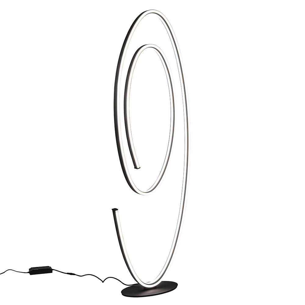 Strakke en sierlijke vloerlamp met energiezuinige LED verlichting. Deze moderne staande lamp heeft twee LED ringen. In de binnenkant van het armatuur en aan de rand. Dit zorg voor een mooie lichtverspreiding. De vloerlamp wordt geleverd inclusief snoer van 190 cm met de schuif dimmer op 80 cm van het armatuur. De staande LED lamp is uitgevoerd in het mat zwart.