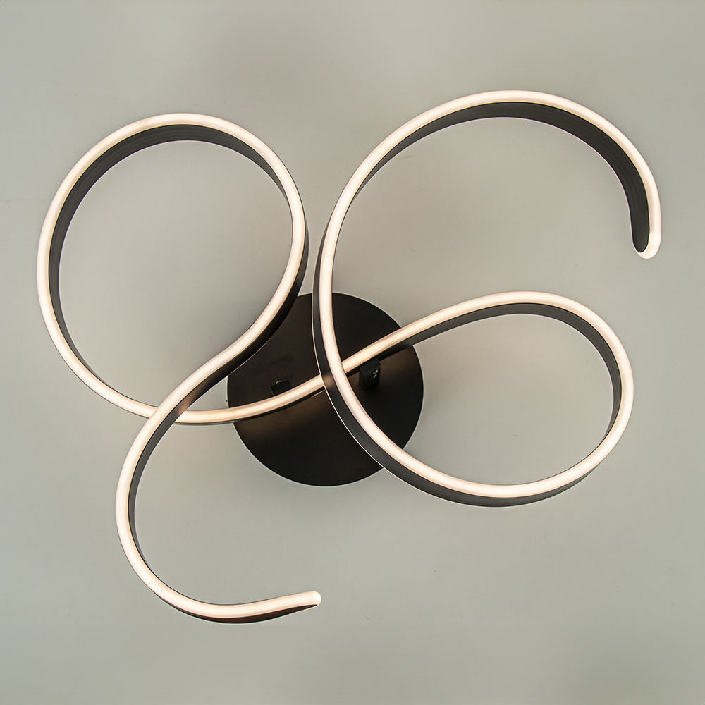 Deze prachtige design plafondlamp met brede krul is een verrijking voor het interieur. De plafondlamp heeft een metalen armatuur dat is uitgevoerd in het zwart. Dit geeft de lamp een moderne en strakke look. De krul is op sierlijke wijze vormgegeven en is in de rand volledig voorzien van een LED strip. Dit zorgt ervoor dat de lamp prachtig mooi diffuus licht geeft. Het licht is met 2700 Kelvin warm wit van kleur en is dimbaar middels een externe dimmer (exclusief). De sierlijke plafondlamp past mooi in een woon- of slaapkamer.