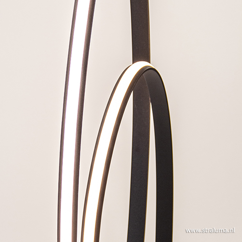 Een moderne ‘design’ vloerlamp met elegante lijnen. De lamp staat op een metalen mat zwarte voet en wordt geleverd inclusief zwart snoer met dimschakelaar. In de kunststof kap zit volledig een LED strip verwerkt. De ronding geeft een speels effect, terwijl de lamp toch een strakke look behoudt. De LED verlichting is met een schuifje op de schakelaar te dimmen en daarnaast is LED ook energiezuinig. Deze vloerlamp past mooi in een modern interieur in bijvoorbeeld een woonkamer.