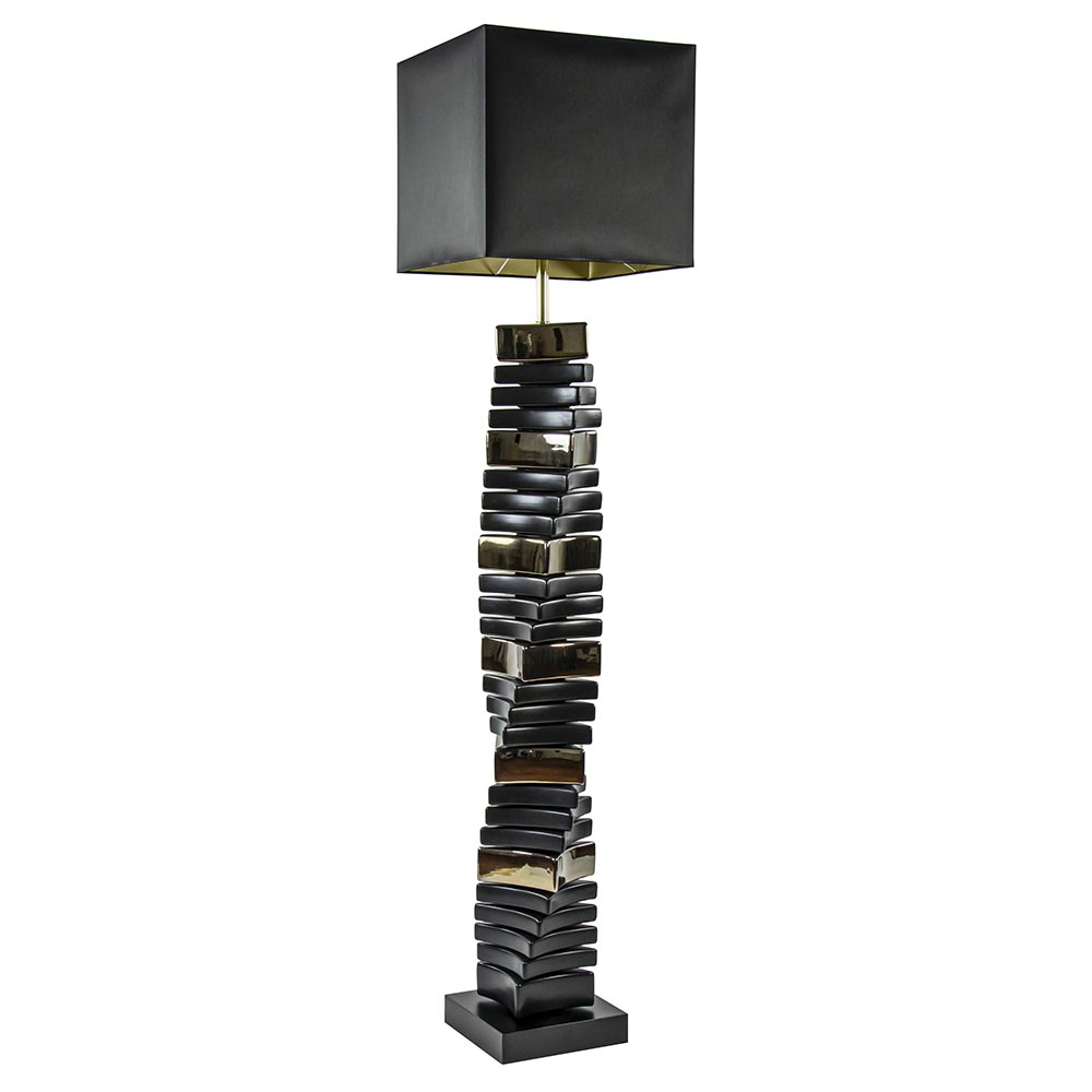Deze prachtige vloerlamp is een ware eyecatcher in het interieur. De staande lamp heeft een keramieken voet die is opgebouwd uit losse delen. Doordat deze verspringen ontstaat er een speels design wat, mede door het goud dat erin verwerkt is, een luxe uitstraling heeft. De voet is gecombineerd met een grote vierkante kap in het zwart/goud. De lamp is een verrijking voor uw woonstijl en staat prachtig naast de bank of in een donkere hoek. De staande schemerlamp is voorzien van een zwart snoer van 135 cm met een schakelaar op 15 cm en wordt exclusief lichtbron geleverd.
