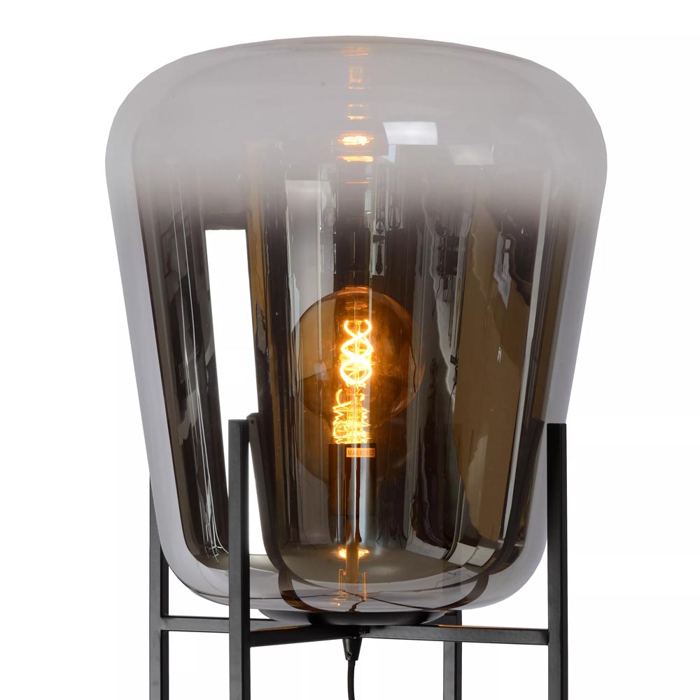 – hoogte: 154,5 cm – kap: Ø45×52,5 cm – voet: 42x42x120 cm – smoke glas – metaal, mat zwart – in hoogte verstelbaar – exclusief lichtbron (E27) – dimbaar (exclusief) – zwart snoer: 180 cm