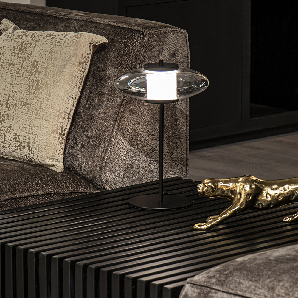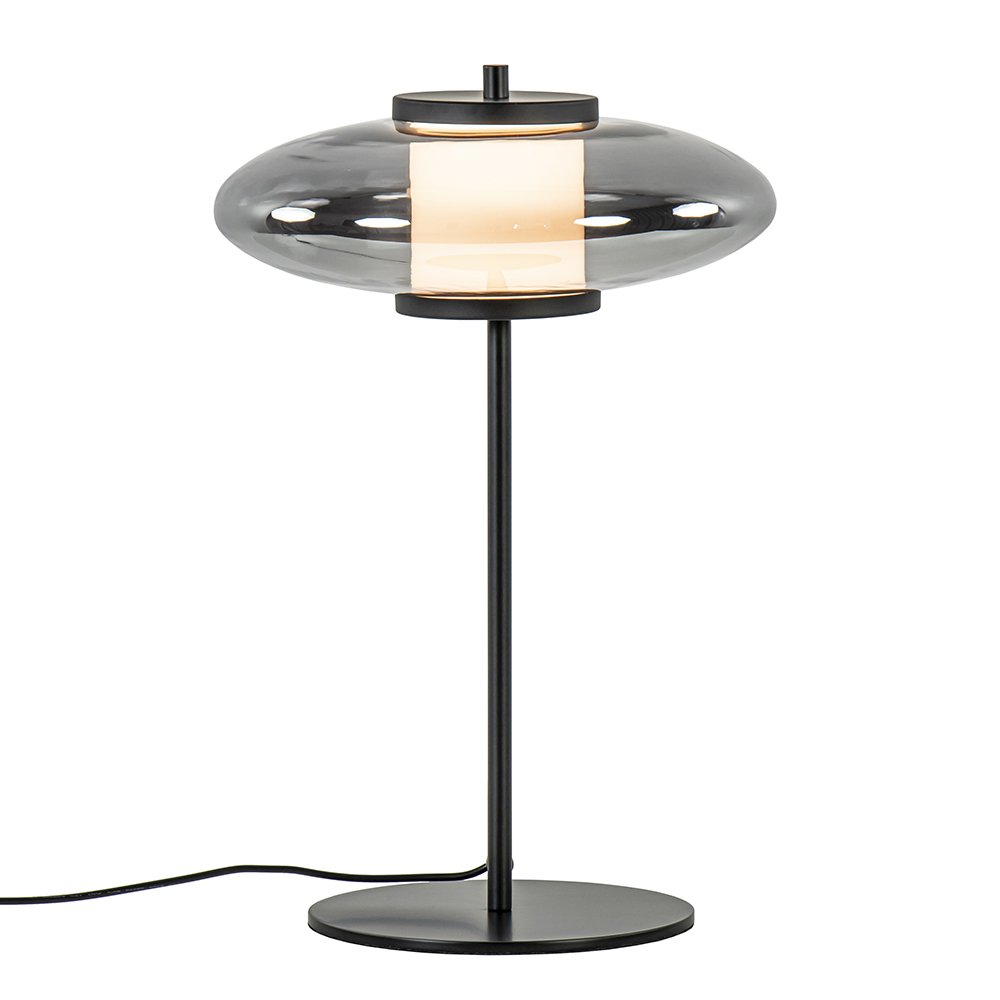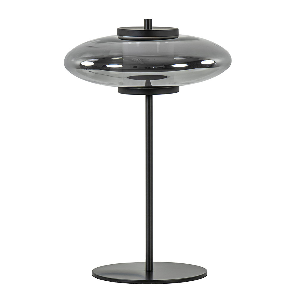 Chic van uitstraling en sfeervol in effect. Deze stijlvolle tafellamp heeft een mat zwart armatuur dat is gecombineerd met een smoke glazen kap. Het glas is van binnen weer voorzien van een mat glazen cilinder die oplicht zodra de lamp wordt ingeschakeld. Dit zorgt voor een mooi effect in het glas. De tafellamp is voorzien van geïntegreerd LED welke gemakkelijk te dimmen is dmv de dimmer in het snoer. Een ideale lamp voor op een dressoir, bijzettafel of het nachtkastje.