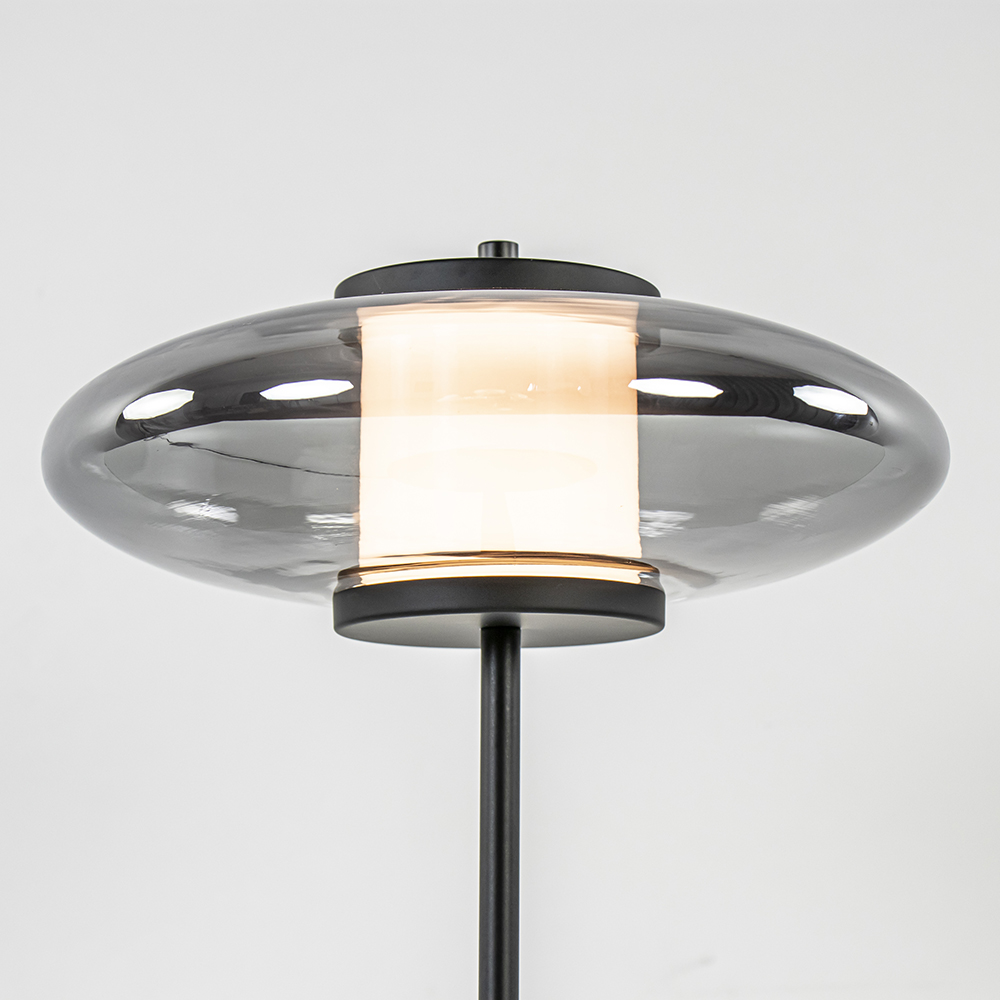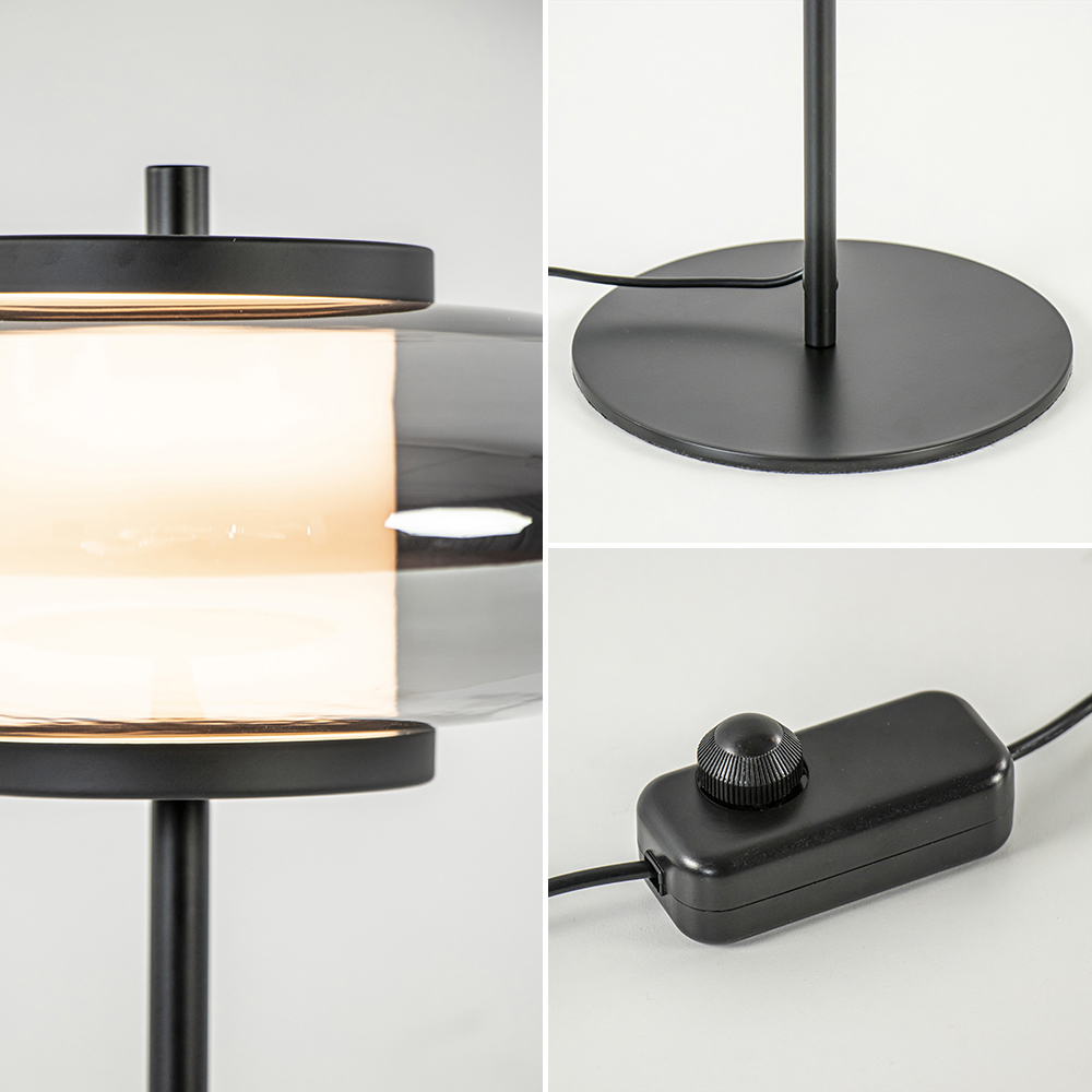 – afm: Ø26×40 cm – voet: Ø18×0,5 cm – kap: Ø25×12 cm – metaal, mat zwart – smoke glas – inclusief LED – 2700 Kelvin – 420 lumen – dimbaar – inclusief dimmer – zwart snoer