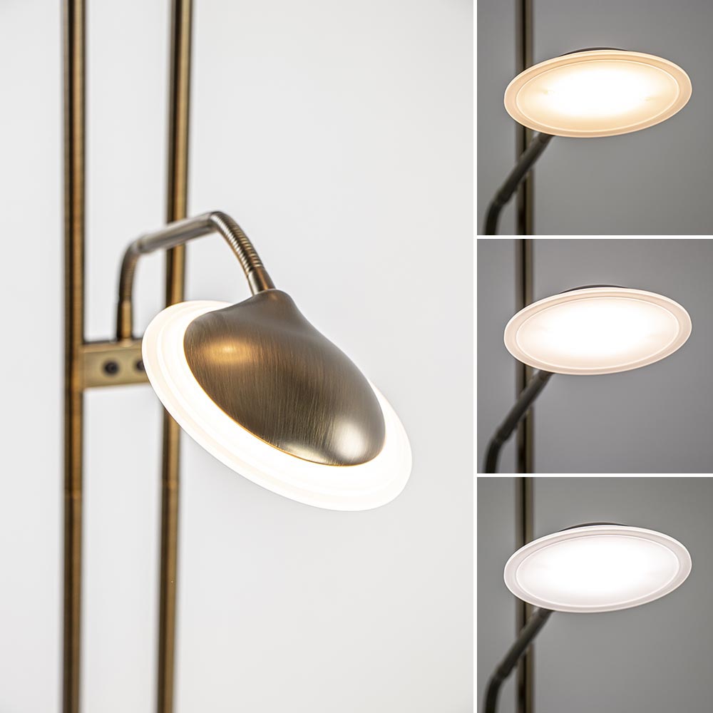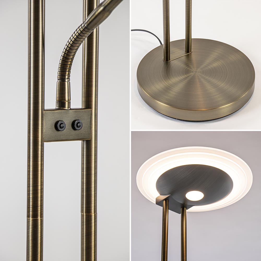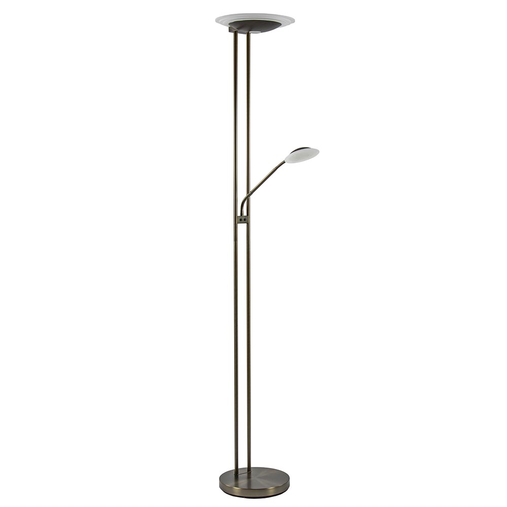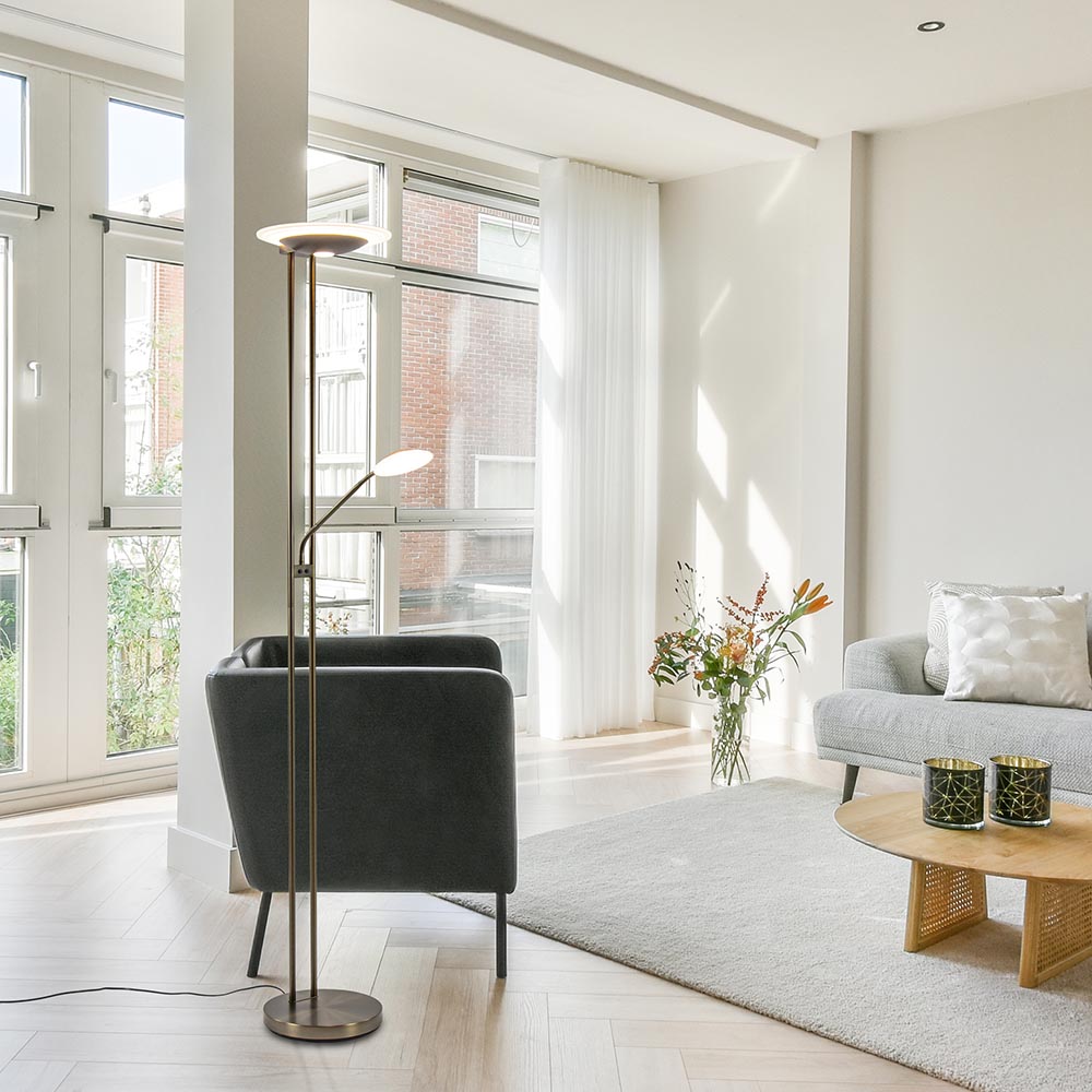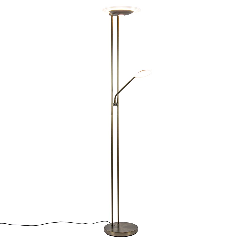 Een prachtige vloerlamp die voorzien is van meerdere functies. De vloerlamp is gemaakt van metaal en uitgevoerd in het donker brons. Dit geeft de staande lamp een chique klassieke look. De vloerlamp heeft 2 lichtpunten, een uplighter en een leeslamp. Beide zijn voorzien van geïntegreerd LED welke dimbaar is middels de dimmers op het armatuur. Door 1 keer te drukken veranderd de kleurtemperatuur van 2700 naar 3500 Kelvin. Drukt u nogmaals dan gaat deze door naar 4000 Kelvin en bij nog een keer drukken gaat de lamp weer uit. Houdt u de dimmer ingedrukt in een van de drie standen, dan dimt de lamp in intensiteit. Dit geldt voor zowel de uplighter als de leeslamp. De leeslamp heeft verder nog een verstelbare arm zodat u gemakkelijk uw favoriete boek kunt lezen.