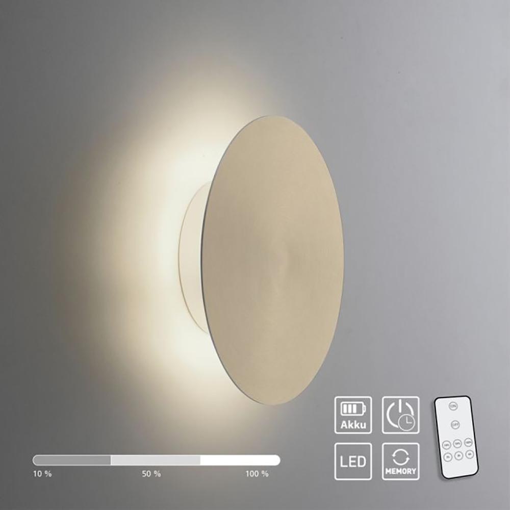 Deze moderne wandlamp is een verrijking voor het interieur. De LED wandlamp is zowel functioneel als effectief en is gemakkelijk is diverse ruimtes te gebruiken. De wandlamp werkt namelijk op een accu en is daardoor overal op te hangen. De ronde wandlamp is gemakkelijk te verwijderen van de wandbeugel zodat deze weer kan worden opgeladen met de meegeleverde USB kabel. De plaat op de wandlamp is uitgevoerd in het goud waarbij de verlichting aan de achterzijde is gemonteerd. Dit zorgt voor een sfeervol effect op de ondergrond. De LED lamp is in 3-standen te dimmen en is voorzien van een timerfunctie. De accu wandlamp heeft een accuduur van 7-40 uur en is gemakkelijk te bedienen met de meegeleverde afstandsbediening.