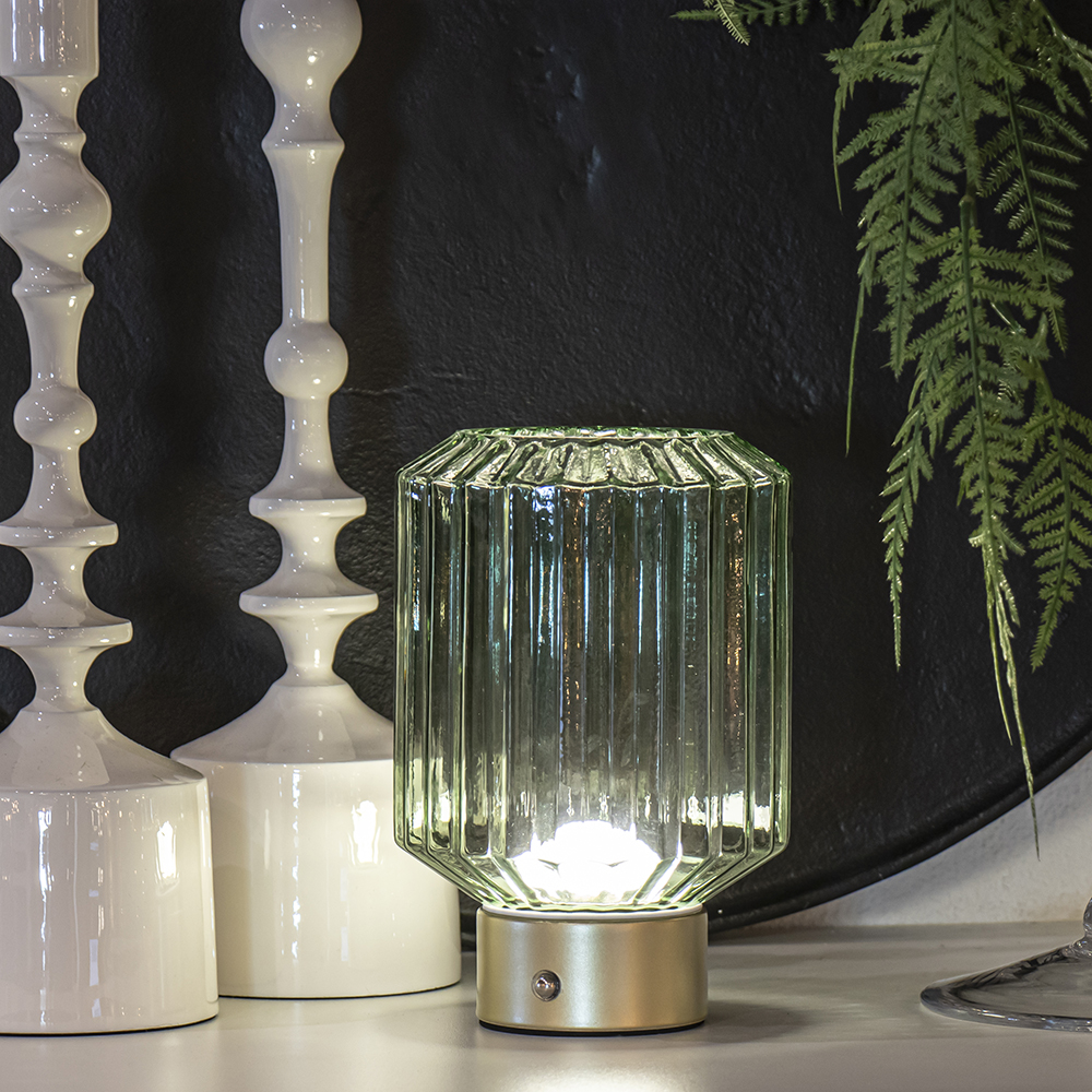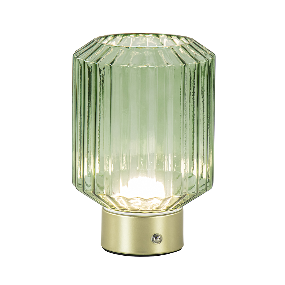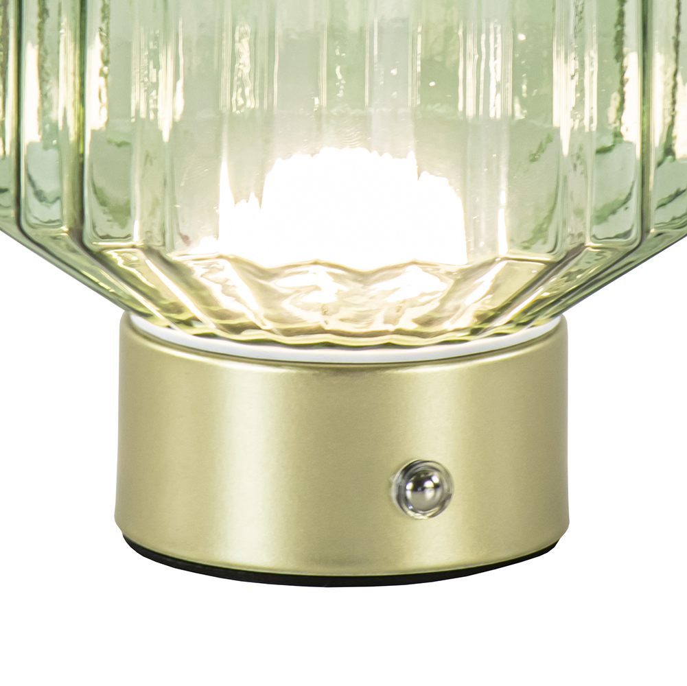 – afm: Ø13×19,5 cm – voet: Ø7,5×4 cm – kap: Ø13×15,5 cm – glas, groen – metaal, goud – inclusief LED – 100 lumen – 3000 Kelvin – 3-standen dimbaar – oplaadbaar – inclusief USB kabel
