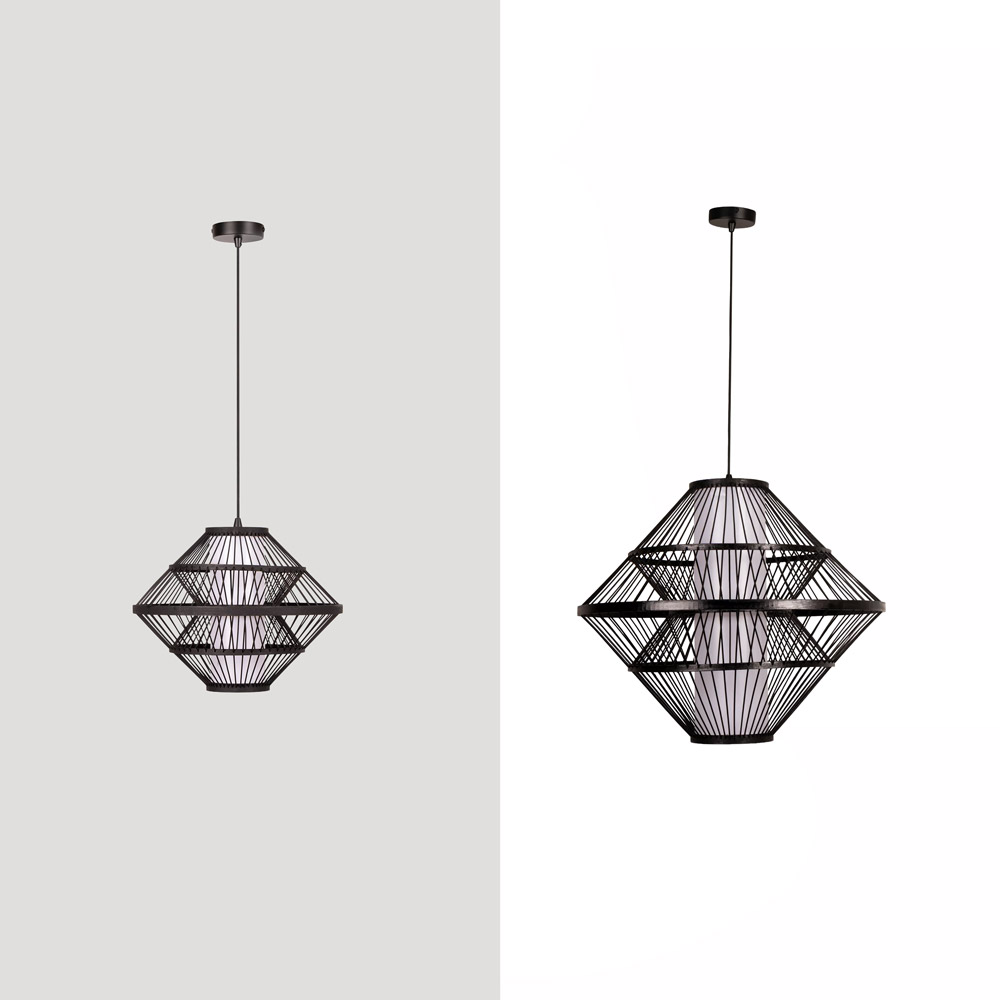 De Pasquino hanglamp combineert de rust van Japandi met een modern grafisch ontwerp. De kap van zwart houtfineer is opgebouwd uit fijne, strak gespannen lijnen die samen een geometrische vorm creëren. Hierdoor ontstaat een speels lijnenspel dat het licht rondom diffuus verspreidt en zorgt voor een warme, sfeervolle gloed.