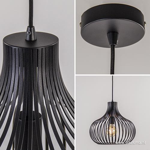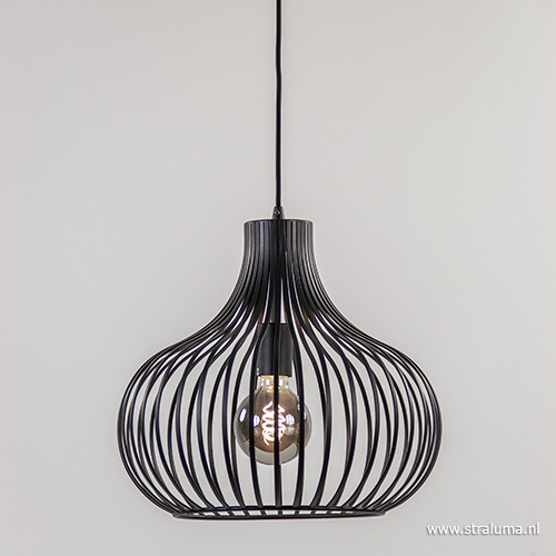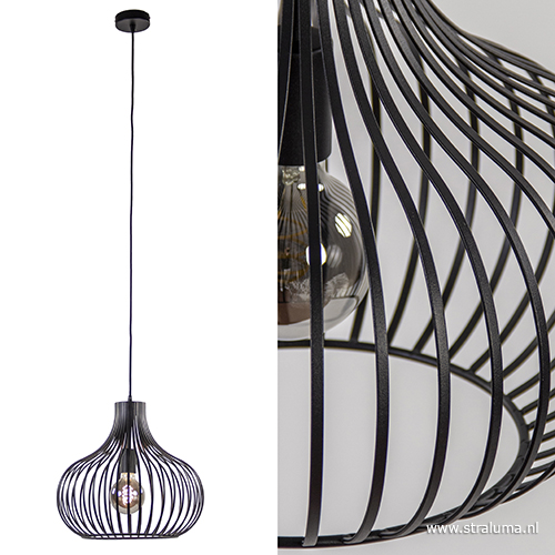 Een sfeervolle hanglamp die prima geschikt is voor een woon- en slaapkamer, hal of keuken. Het metalen frame bestaat uit losse speilen die bovenaan de kap samen komen tot één geheel. De kap is van onder open en hangt aan een zwart stofomwonden snoer die in hoogte is te verstellen. De mat zwarte draadlamp wordt aan het plafond opgehangen met een ronde plafondbevestiging. Deze ‘zwarte’ hanglamp brengt met de juiste lichtbron een gezellige sfeer in huis en past mooi in een modern of scandinavisch interieur.