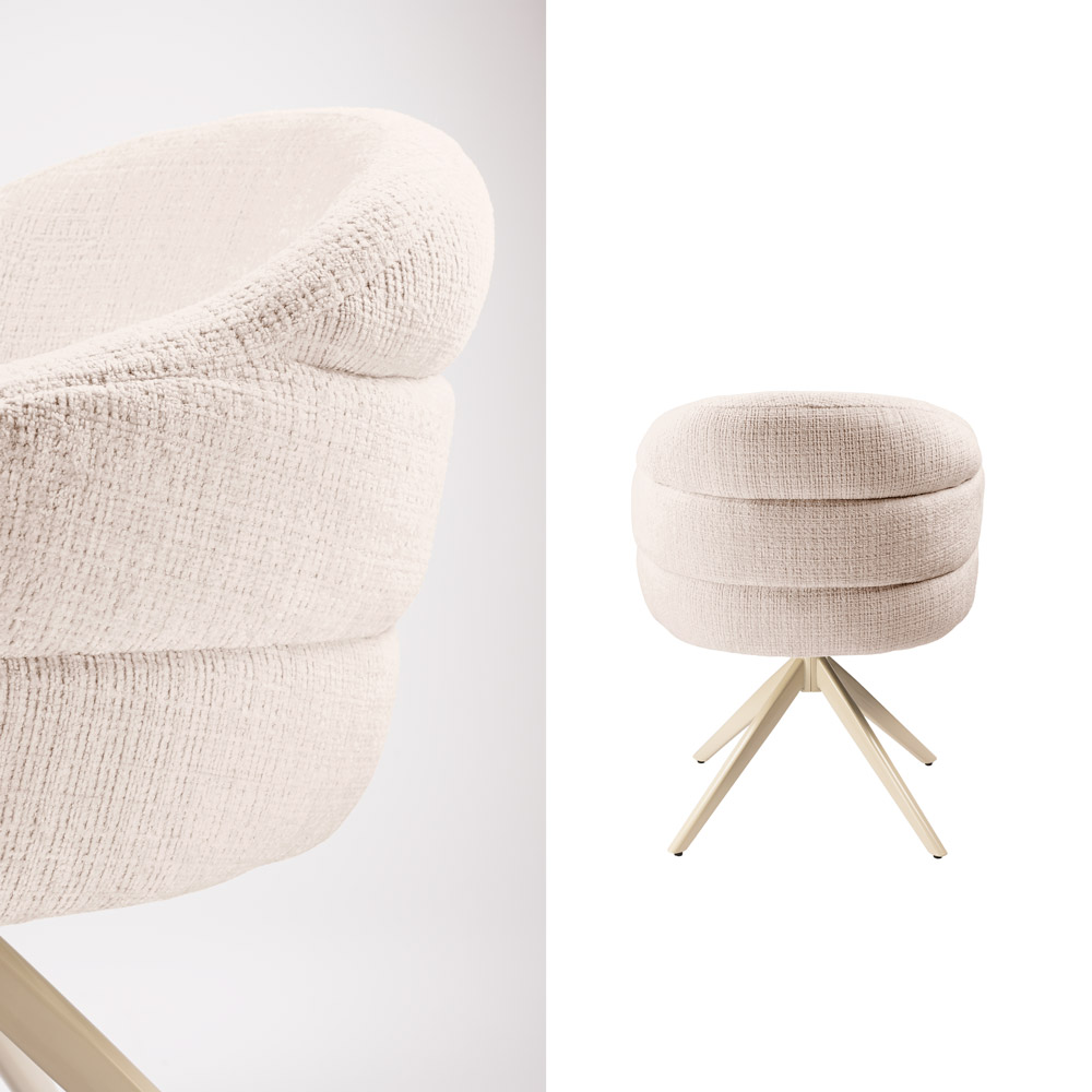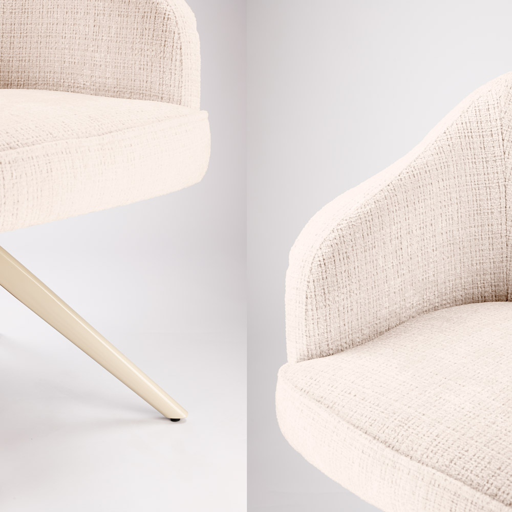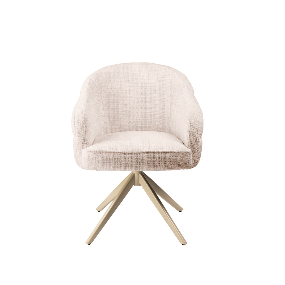 Highlights • Draaibare eetkamerstoel met auto-return functie (draait vanzelf terug) • Comfortabele kuipvorm met geïntegreerde armleuningen • Verkrijgbaar in 4 kleuren: clay, beige, cinnamon en off white • modern beige metalen onderstel • Ideaal voor een opgeruimde, rustige uitstraling rond de eettafel