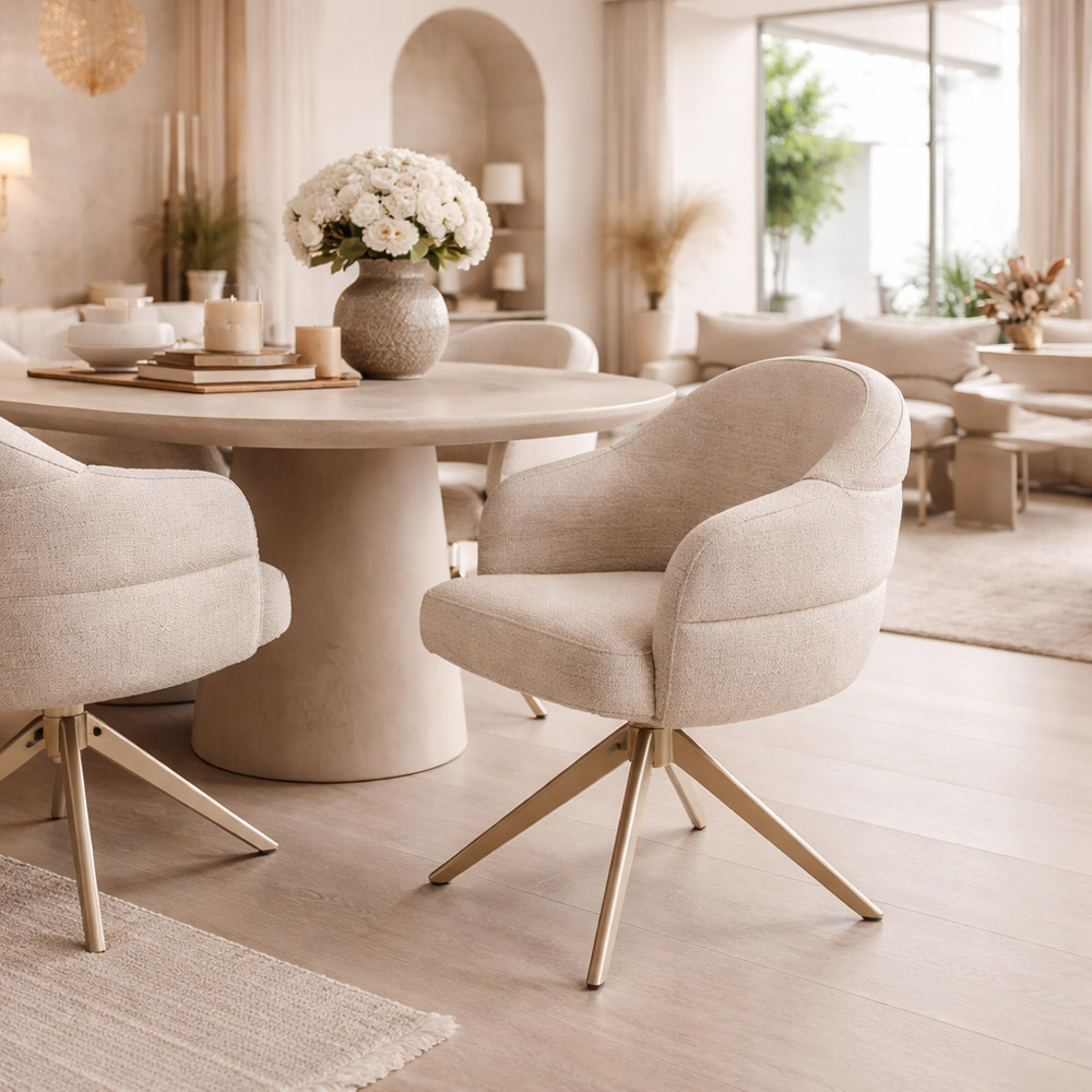 Eetkamerstoel Bella – draaibaar met auto-return – armleuningen – Beige
