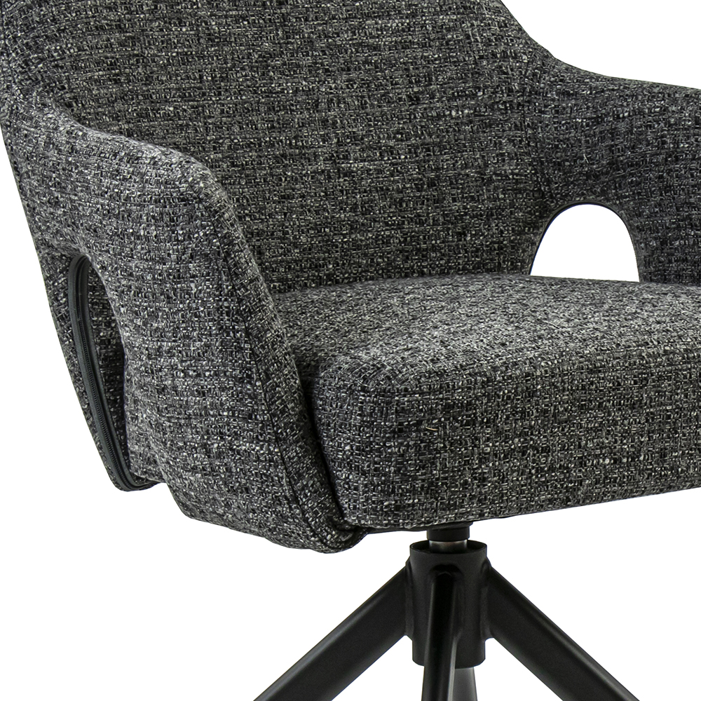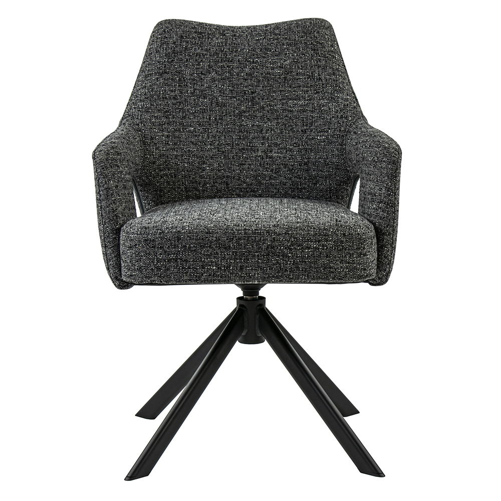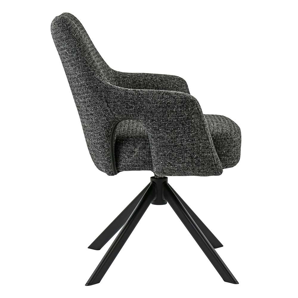 Deze comfortabele eetkamerstoel maakt dineren en borrelen een waar genot. De armstoel heeft een zachte stoffen zitting met een hoge rugleuning en armleuningen voor extra support. De stoel is draaibaar en voorzien van een return-system zodat de stoel automatisch weer terug draait. De stof heeft een grove structuur en is uitgevoerd in het donker grijs.
