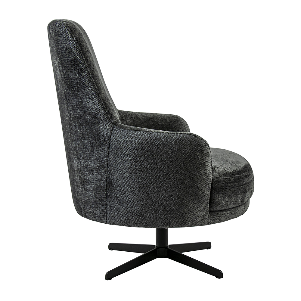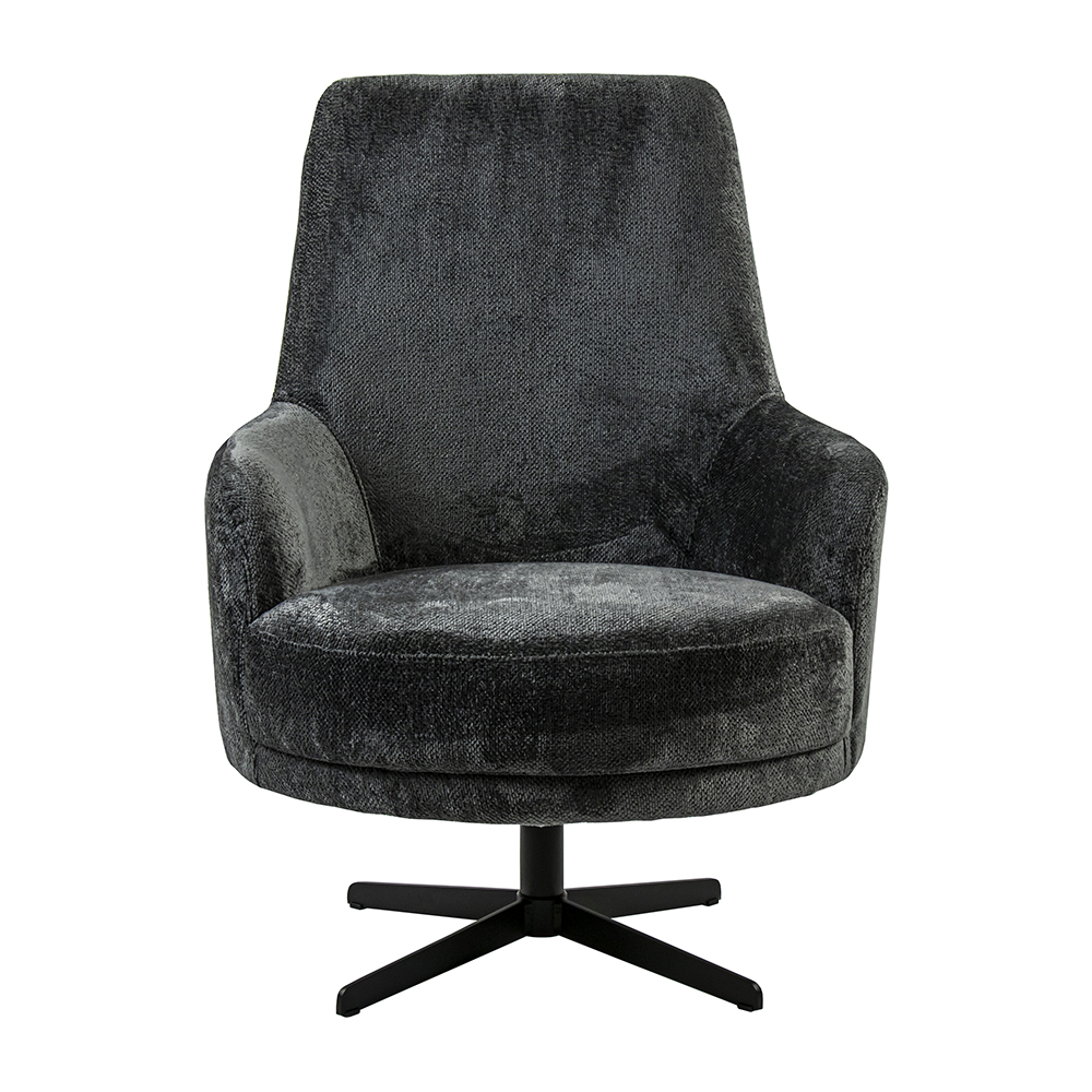 Heerlijk relaxen met een boek of onderuit voor de tv. Alles kan in deze fijne relax fauteuil. De draaibare fauteuil heeft een hoog zitcomfort en kan 360° draaien. Ideaal wanneer de stoel midden in de kamer staat. De fauteuil heeft een stoffing zitting die is uitgevoerd in het donker grijs. De zwart metalen poot maakt de armstoel helemaal af.