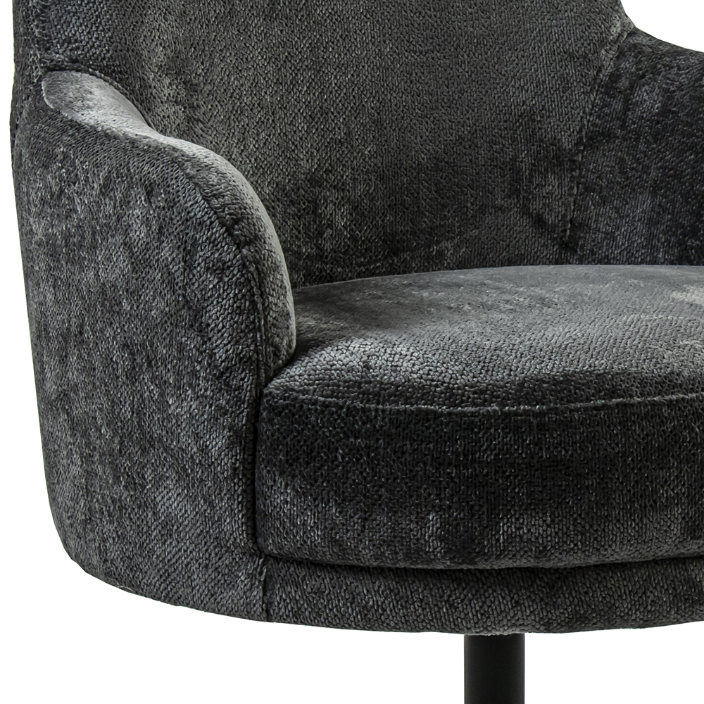 – afm: 71x83x98 cm – zithoogte: 46 cm – zitdiepte: 67 cm – zitbreedte: 50 cm – materiaal zitting: stof, velours – kleur zitting: donker grijs – materiaal poot: metaal – kleur poot: zwart – 360° draaibaar – max draagvermogen: 120 kg