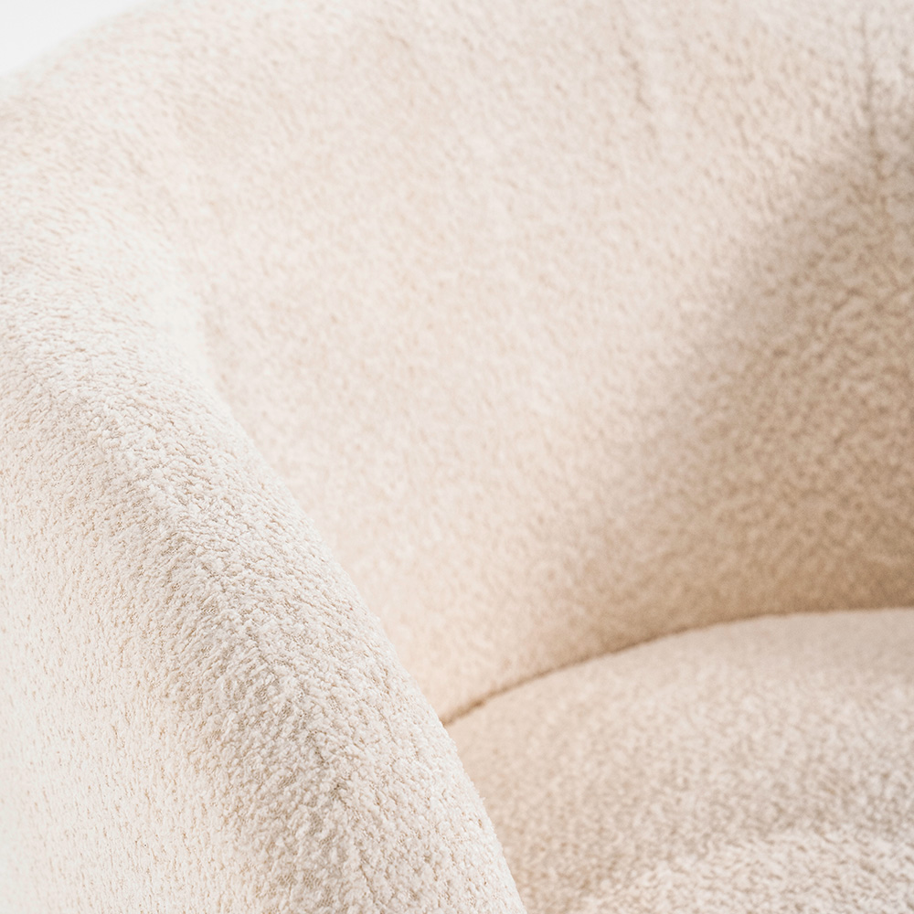 De “Balou” draaifauteuil in beige bouclé staat garant voor een uitnodigende zithoek. Met zijn ronde, enveloppante vormen en soepele draaibasis is hij perfect voor ontspannen leesmomenten of een gezellig praatje.