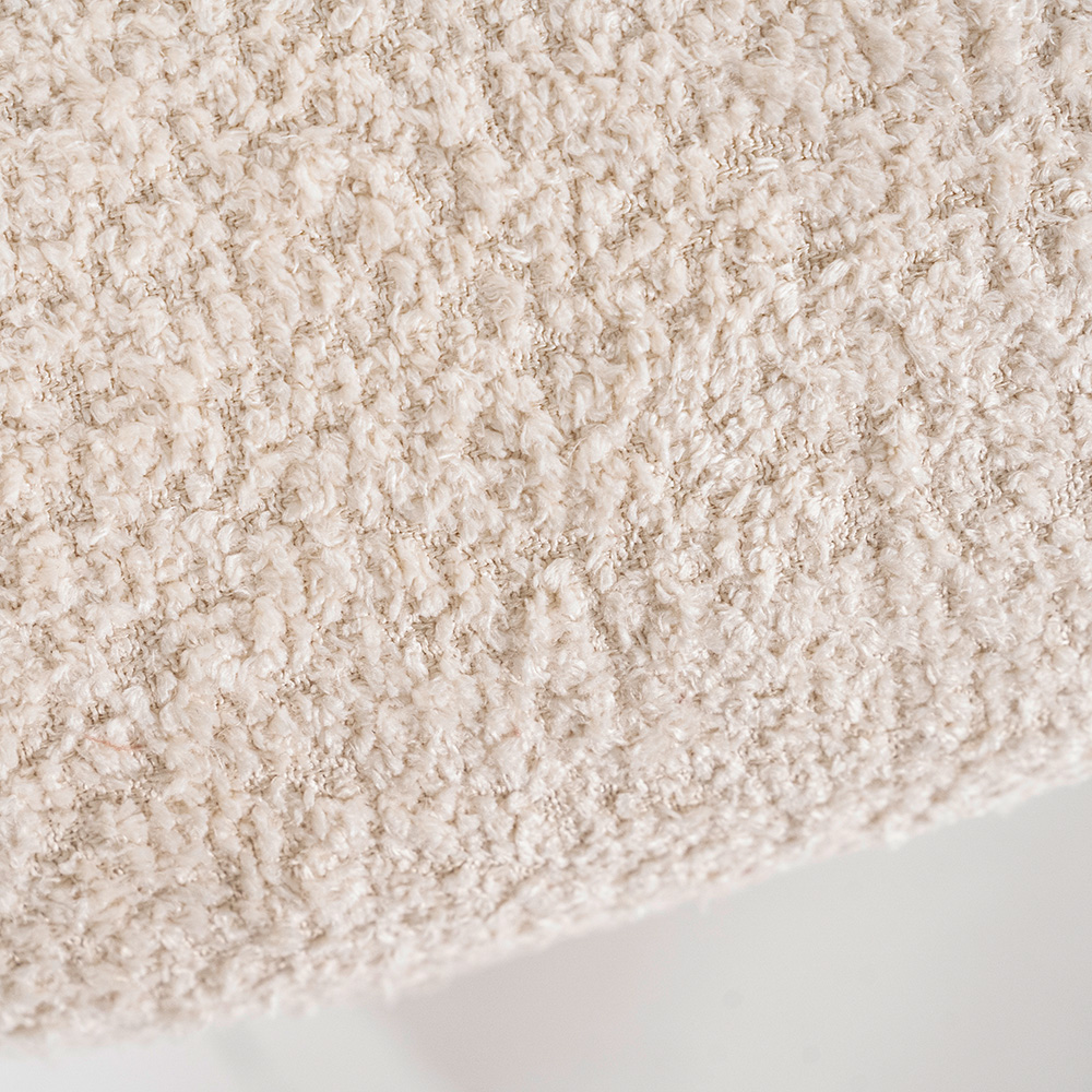 Belangrijkste kenmerken • Afmetingen: 75 × 75 × 80 cm (b × d × h) • Zithoogte: ± 45 cm • Kleur: Gebroken wit / beige • Bekleding: 100% polyester bouclé • Frame & onderstel: Gepoedercoat metaal met 360° draaimechaniek • Vulling: HR-schuim voor optimale veerkracht • Gewicht: ± 14 kg • Belastbaarheid: tot 120 kg • Onderhoud: Vlekken direct afnemen met een zachte, vochtige doek • Stijl: Modern • Boho • Scandinavisch