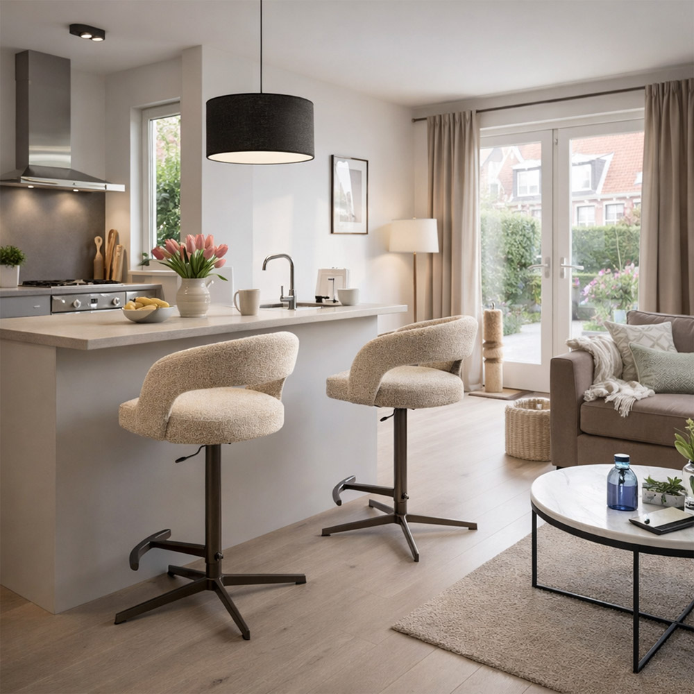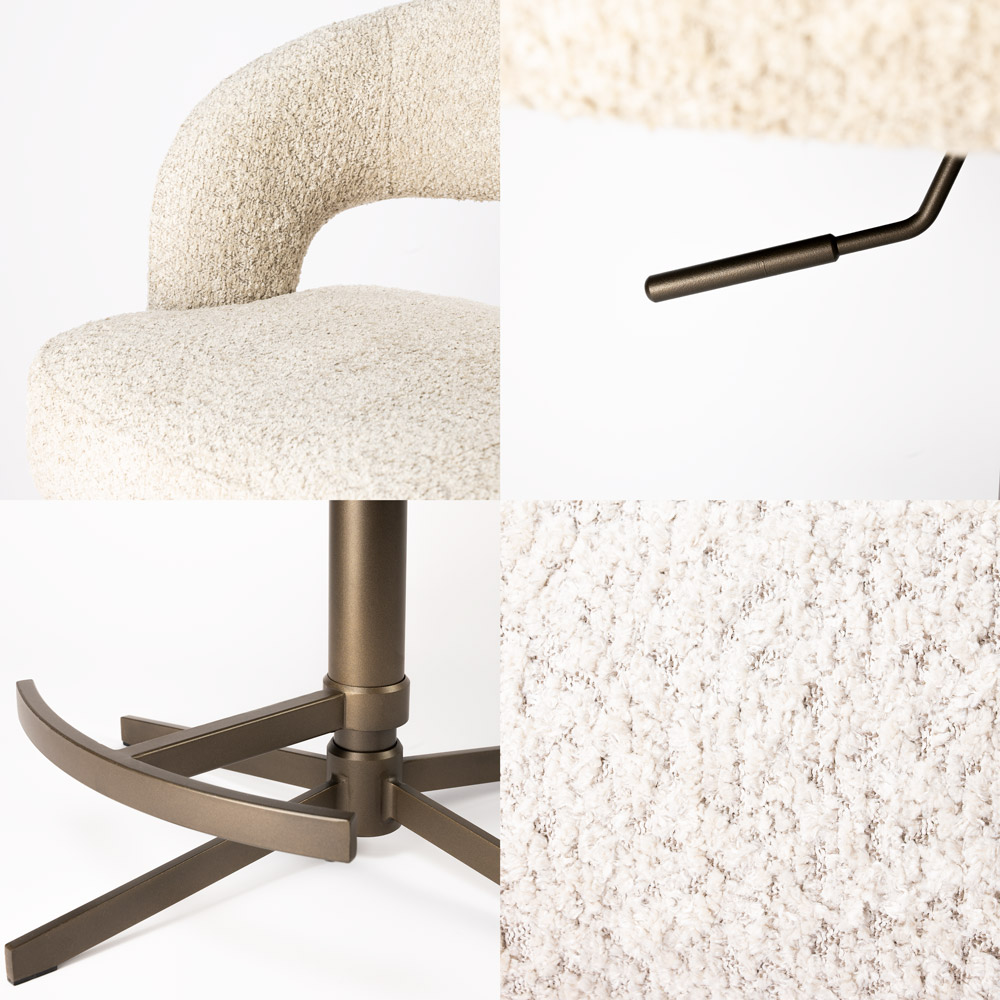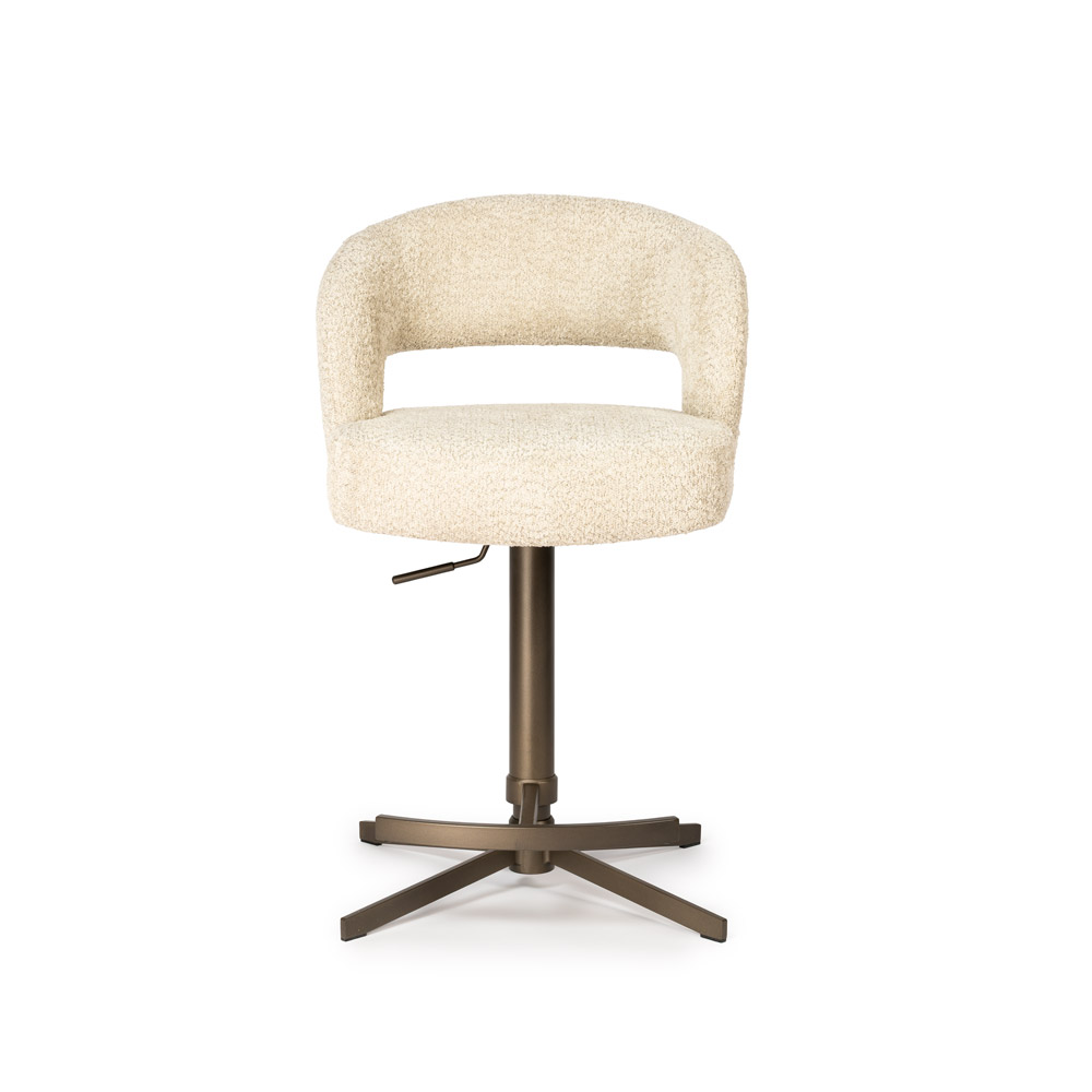 • Draaibare barstoel met comfortabele kuipvorm • In hoogte verstelbaar van 60 tot 90 cm zithoogte • Zachte, luxe stoffering met warme uitstraling • Stabiele metalen voet met geïntegreerde voetensteun • Perfect voor kookeiland of bartafel