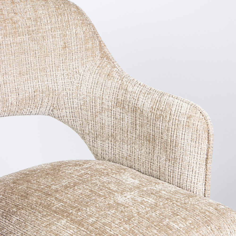 • Luxe Texarm-stof in drie stijlvolle kleuren • Comfortabele zit met armsteunen • Modern design met zachte rondingen • Draaifunctie — ideaal voor aan de eettafel • Stevig zwart metalen onderstel
