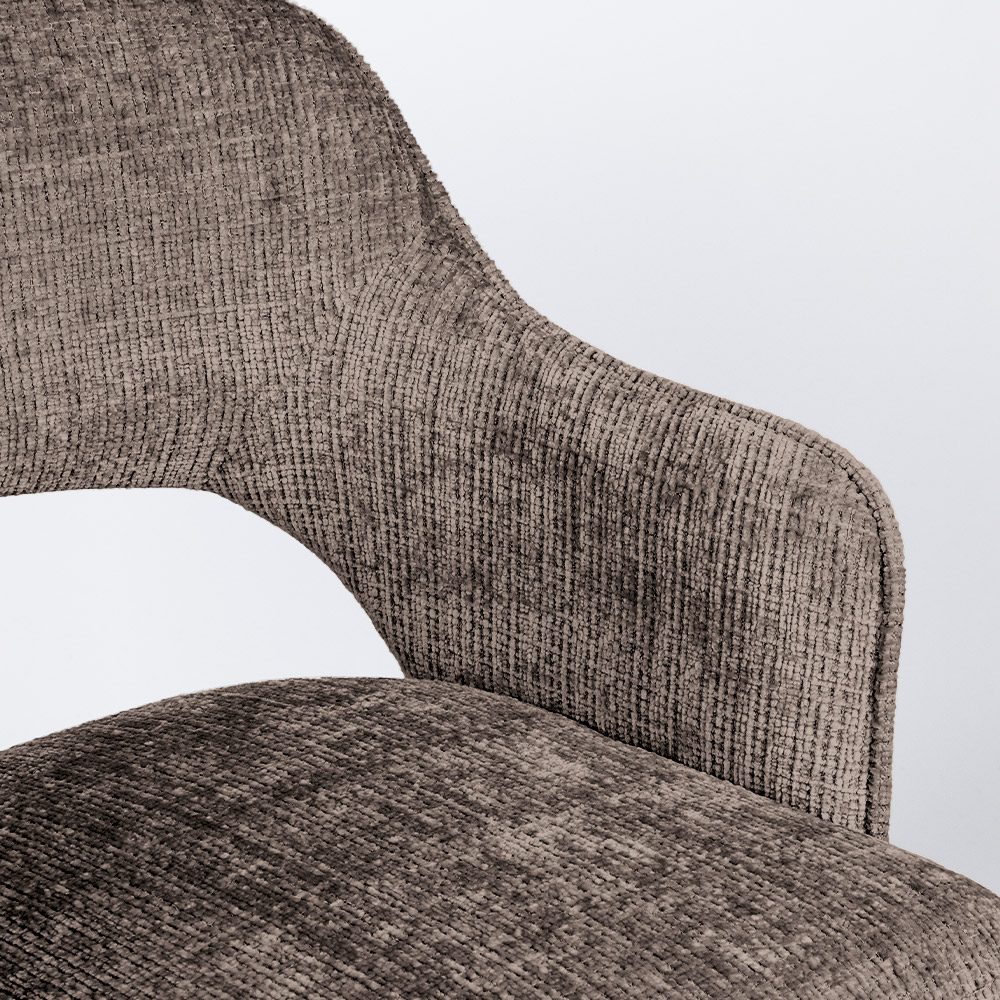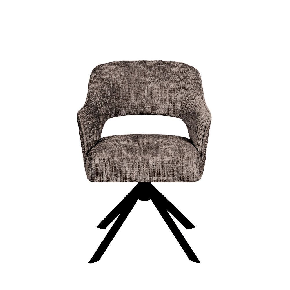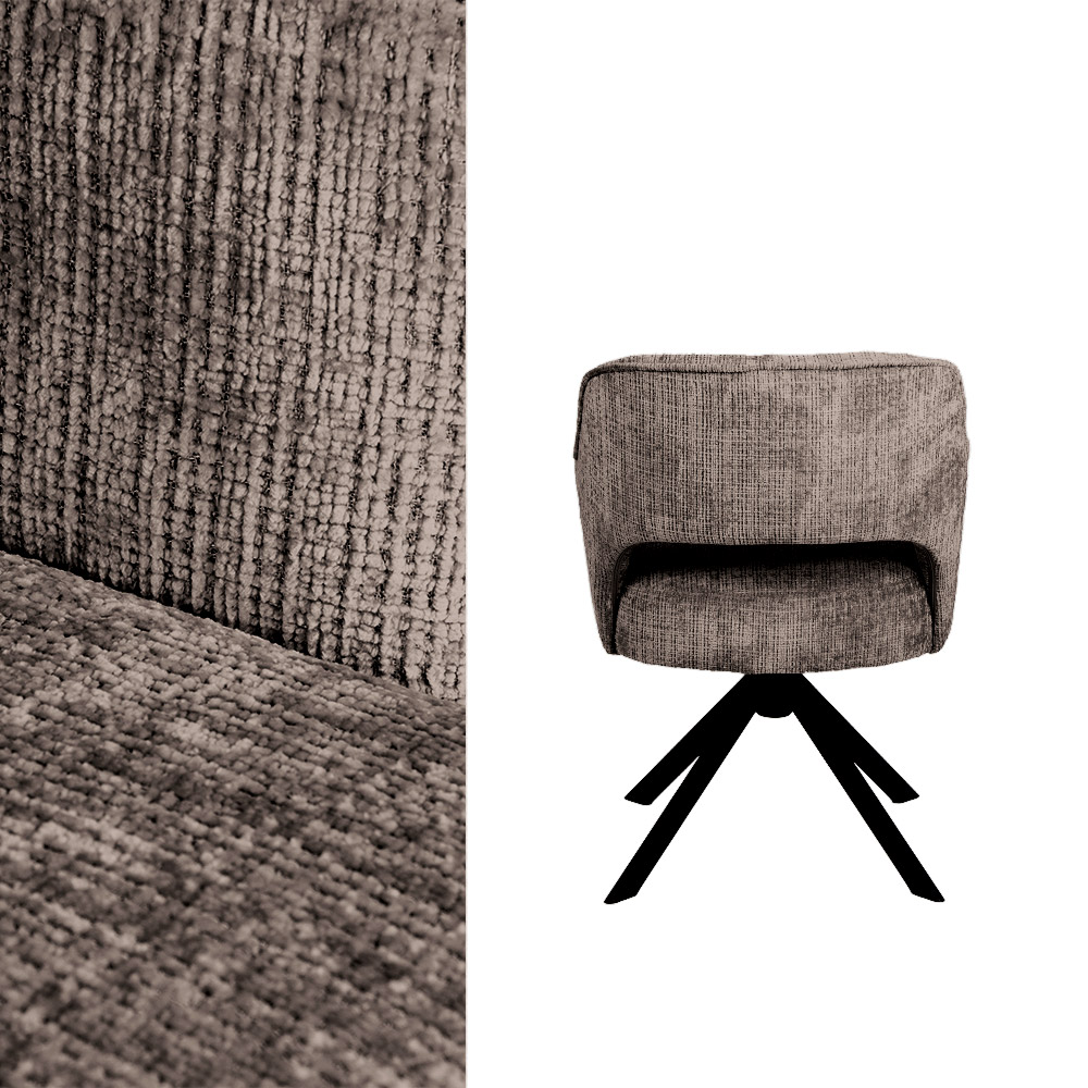 • Luxe Texarm-stof in drie stijlvolle kleuren • Comfortabele zit met armsteunen • Modern design met zachte rondingen • Draaifunctie — ideaal voor aan de eettafel • Stevig zwart metalen onderstel