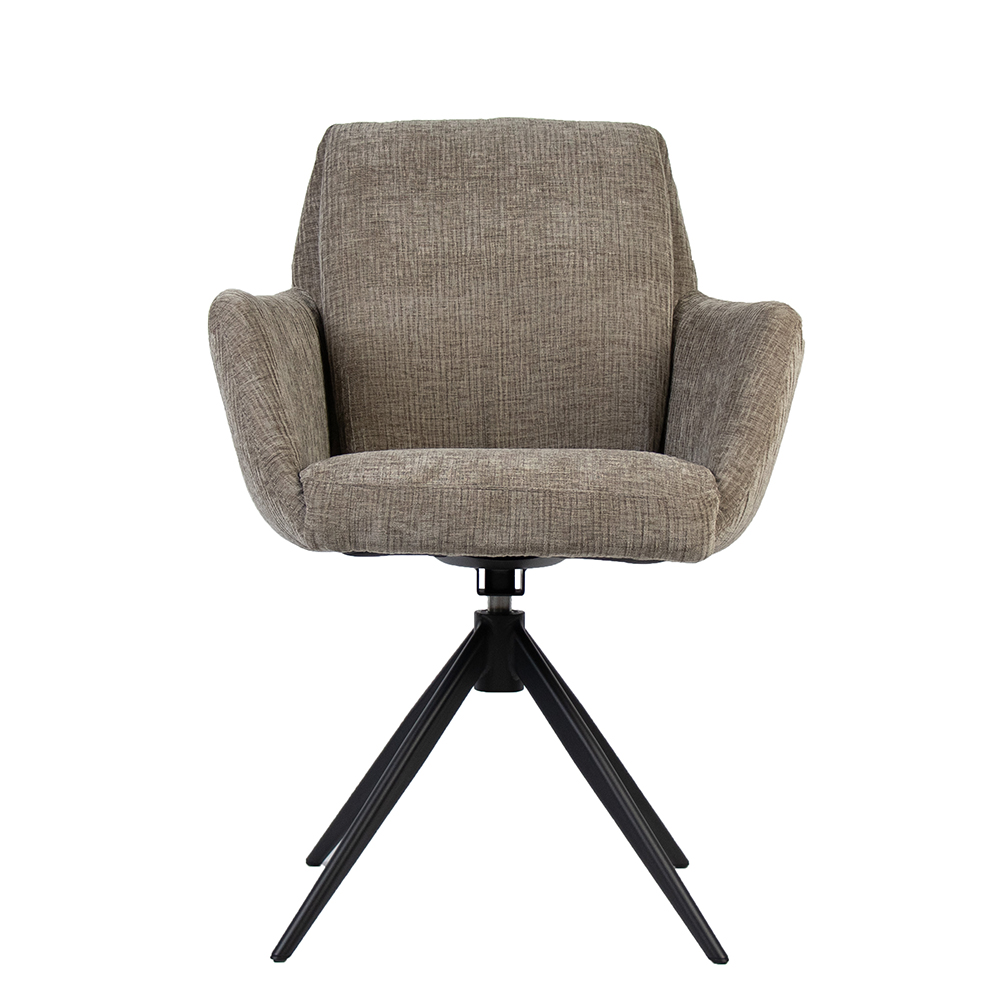 Deze eetkamerstoel zorgt voor maximaal comfort tijdens het dineren. De stoel is draaibaar en is voorzien van een return-system, waardoor de stoel automatisch weer terugdraait. De armstoel heeft een stoffen zitting die is uitgevoerd in de keur clay met een leuk subtiel patroon. Dit is verder mooi gecombineerd met chique mat zwarte poten.