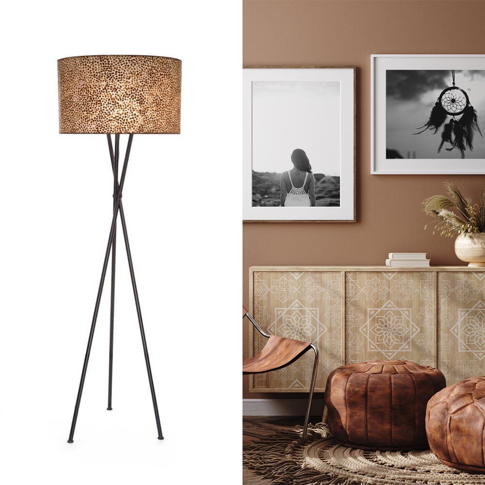 Homepagina / Lampen / Schelpenlampen / Driepoot schelpen vloerlamp zwart met bruin en goud