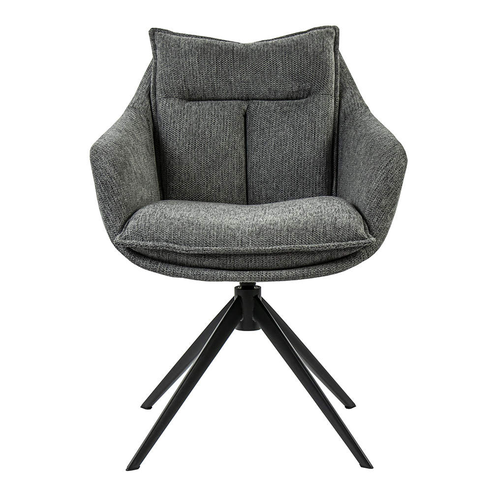 Deze comfortabele eetkamerstoel maakt dineren en gezellig borrelen een waar genot. De armstoel heeft een zachte stoffen zitting met een hoge rugleuning en armleuningen voor extra support. De stoel is draaibaar en voorzien van een return-system zodat de stoel automatisch weer terug draait. De stof heeft een grove structuur en is uitgevoerd in het grijs.