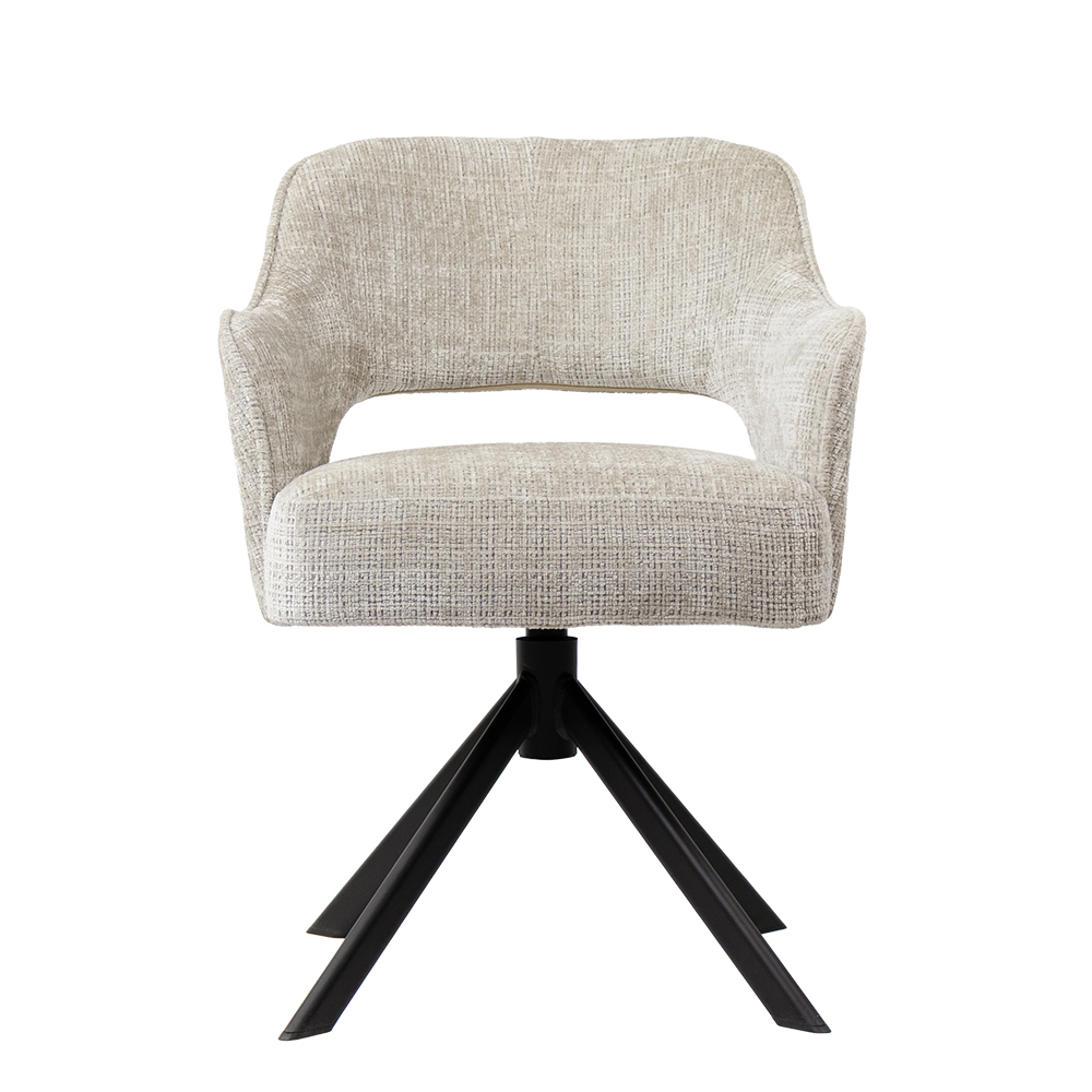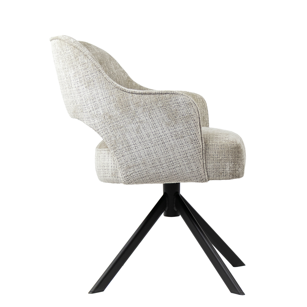 • Luxe Texarm-stof in drie stijlvolle kleuren • Comfortabele zit met armsteunen • Modern design met zachte rondingen • Draaifunctie — ideaal voor aan de eettafel • Stevig zwart metalen onderstel