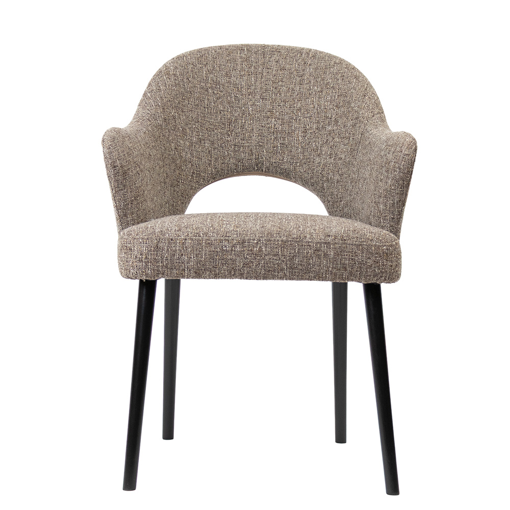 Voeg comfort en stijl toe aan je eetruimte met deze eigentijdse eetkamerstoel. De stoel is bekleed met een grof geweven stof in een warme, neutrale bruintint die gemakkelijk te combineren is met diverse interieurstijlen. De subtiele kleurvariaties in de stof geven het geheel een levendige, natuurlijke uitstraling. Dankzij de gebogen rugleuning en geïntegreerde armleuningen biedt deze stoel uitstekende ondersteuning en zitcomfort, perfect voor lange diners of gezellige avonden aan tafel. De zwarte metalen poten zorgen voor een modern contrast en bieden een stabiele basis.