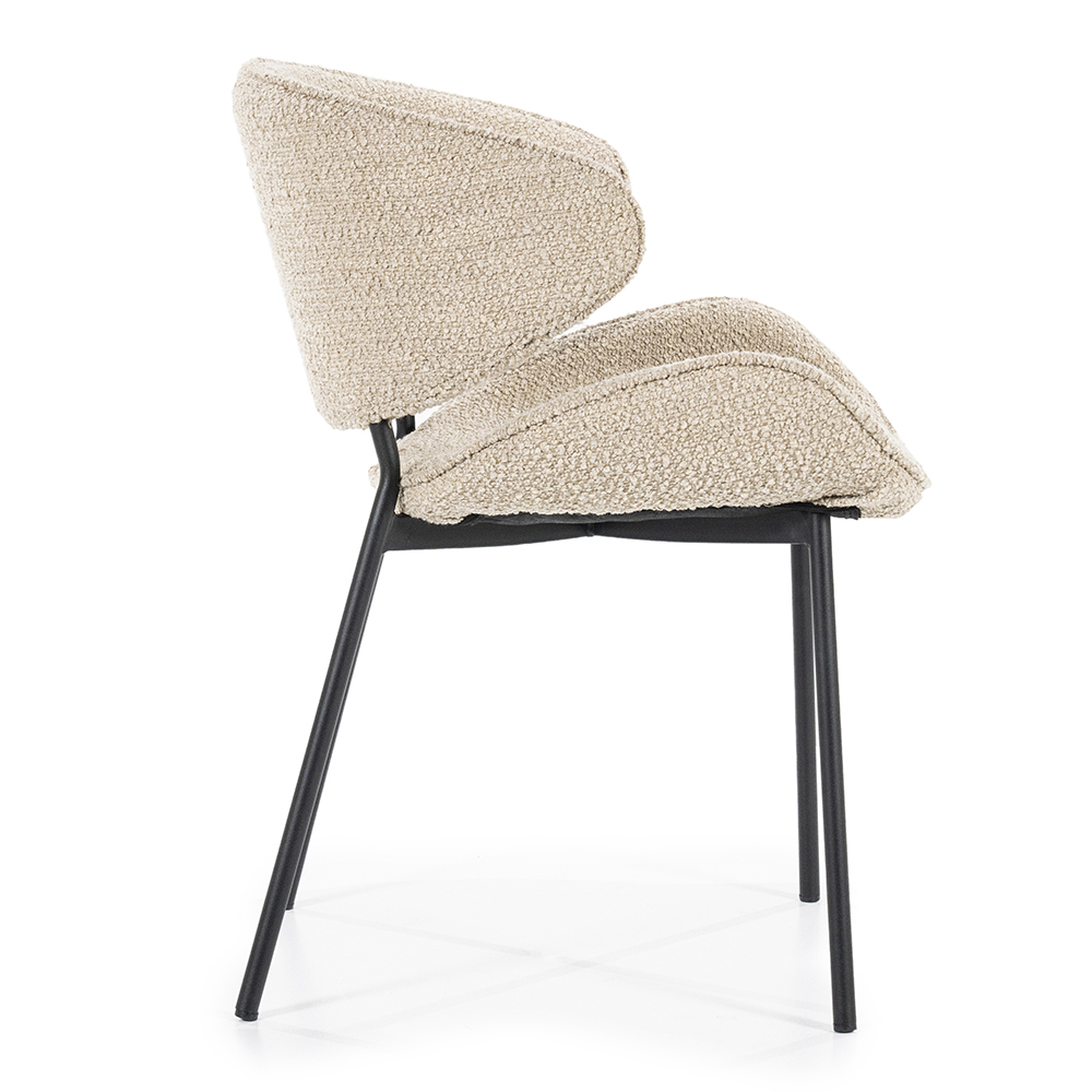 Trendy eetkamerstoel met een brede zitting. De ronde vormen van de stoel zorgt voor extra zitcomfort. Het frame van de stoel is van metaal met een mat zwarte afwerking. Deze stoel komt in 4 kleuren.