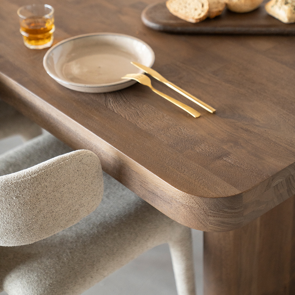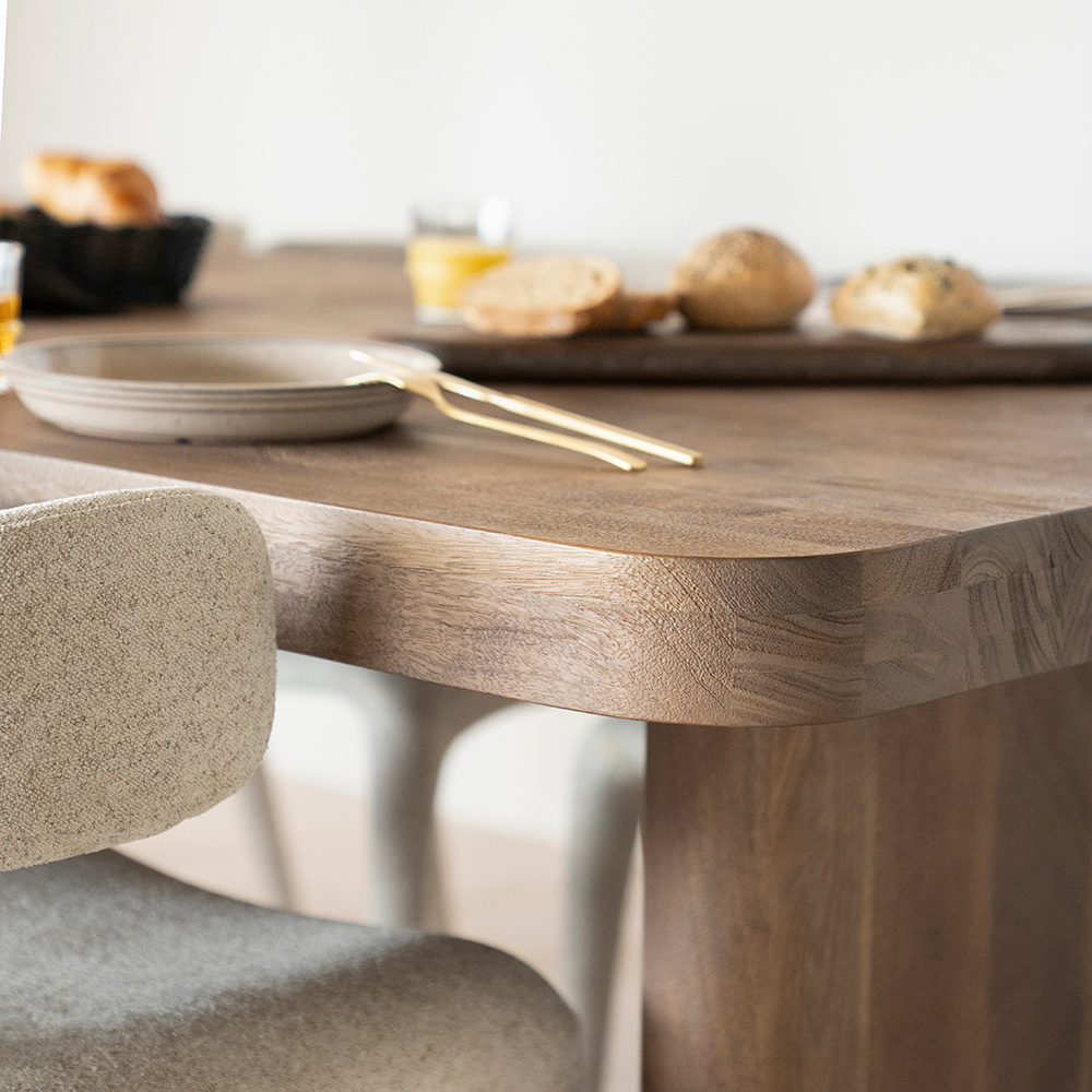Deze massieve houten eettafel brengt natuurlijke warmte en stoere elegantie in je interieur. Dankzij de robuuste blokpoten heeft de tafel een stevige uitstraling, terwijl de subtiele rondingen van het tafelblad zorgen voor een zachte touch. Ideaal voor uitgebreide diners of gezellige momenten met vrienden en familie, en past perfect in zowel moderne als landelijke woonstijlen.