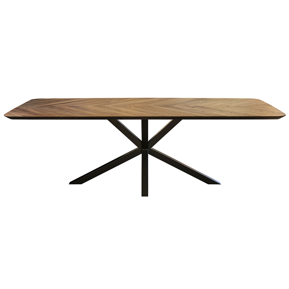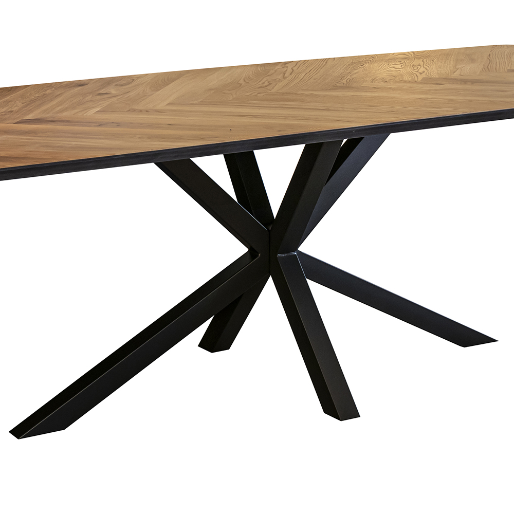 Deze chique eettafel maakt dineren een nog groter plezier. De tafel heeft een rechthoekig blad met afgeronde hoeken en is voorzien van een visgraat afwerking. Het blad is gemaakt van eiken hout en is verkrijgbaar in 3 verschillende afwerkingen, white wash, honey en pole grey. Het blad heeft een dikte van 4 cm en wordt ondersteund door een metalen kruispoot in het gepoerdercoat zwart.
