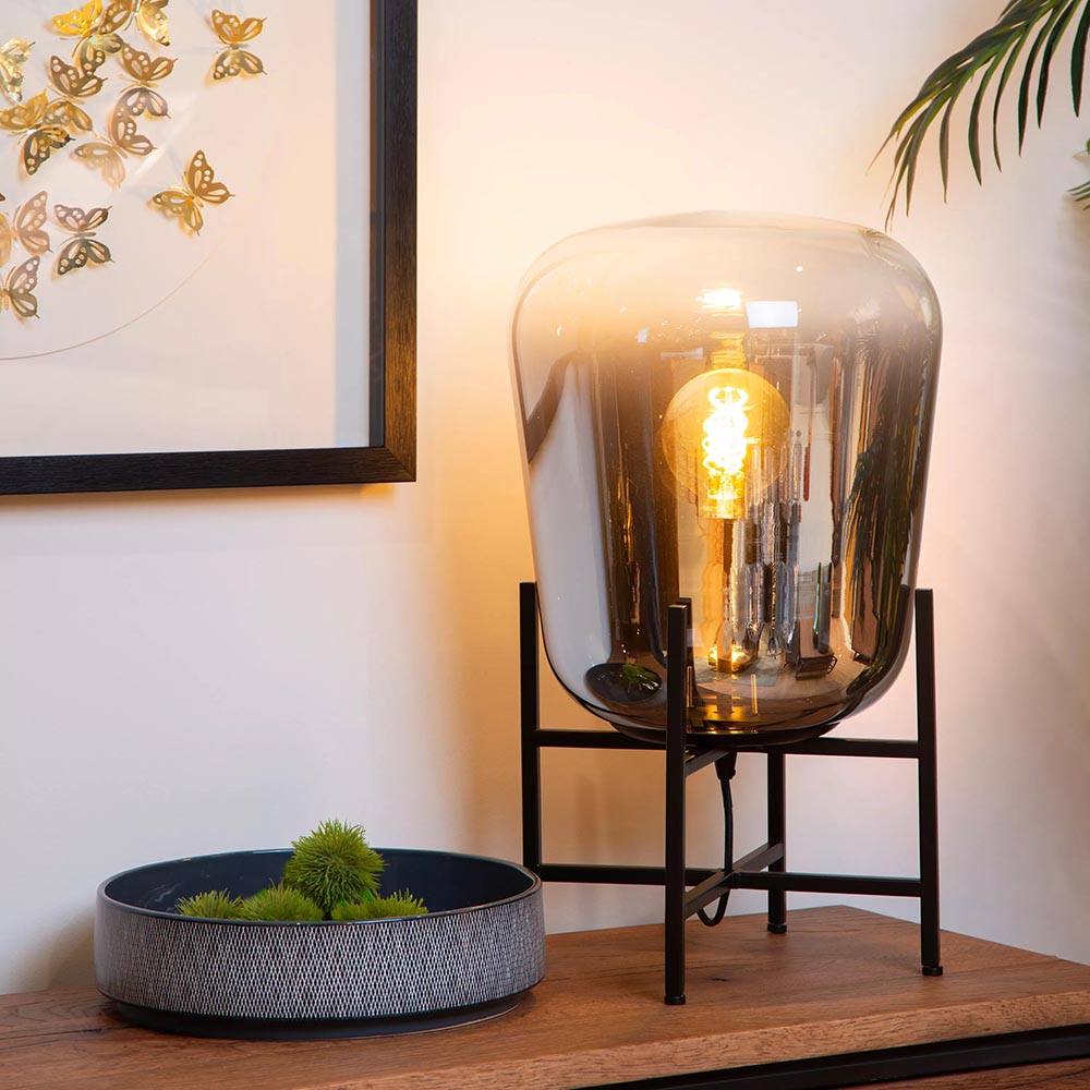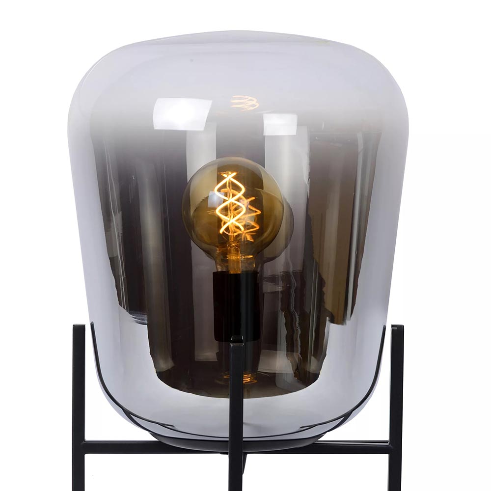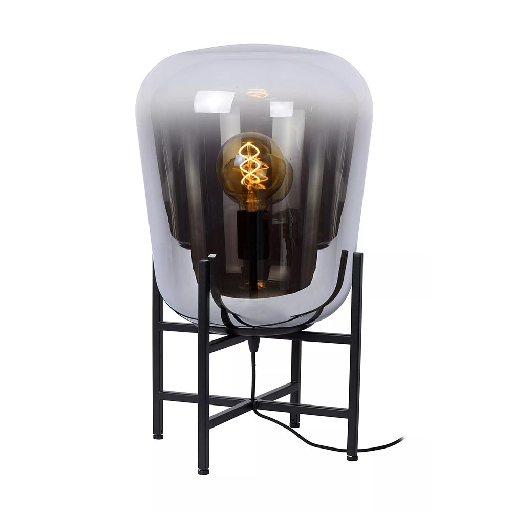Deze elegante tafellamp maakt het interieur helemaal af. Mooi op een dressoir of bijzettafel. De tafellamp bestaat uit een metalen frame als voet die is uitgevoerd in het zwart en een smoke glazen kap met een verloop naar helder. Het donkere glas geeft de tafellamp een chique luxe uitstraling die mooi matcht met de huidige woontrends. De grote tafellamp zorgt met diffuus licht voor een fijne sfeer. De glazen tafellamp is voorzien van een zwart snoer met een lengte van 170 cm. De lichtbron is exclusief.