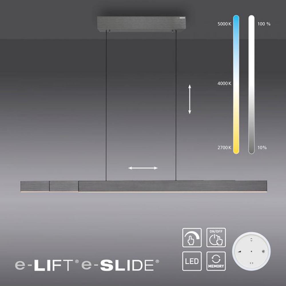 – hoogte: 35-240 cm – lengte: 120-200 cm – breedte: 8,2 cm – bevestiging: 55x8x8 cm – metaal – inclusief LED – 1900 lumen – 2700 – 5000 Kelvin – e-slide + e-lift functie – dimbaar – memory – inclusief remote – gewicht: 7,5 kg