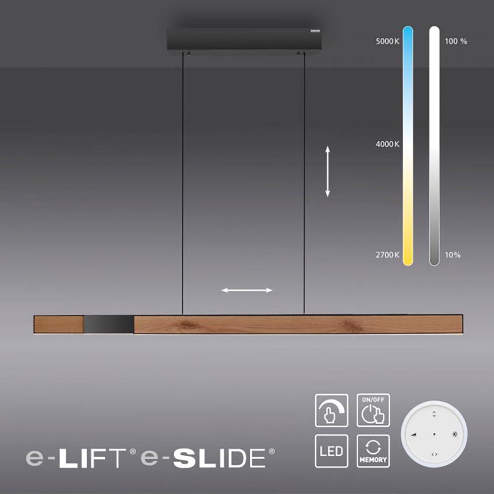 Functie, sfeer, design en luxe komen allemaal samen in deze moderne LED hanglamp. De hanglamp heeft een strak design dat is uitgevoerd in het zwart met hout. De LED eetkamerhanglamp is voorzien van 3 lichtpunten wat zorgt voor voldoende licht. Dit is gemakkelijk te bedienen dmv de touchdimmer bovenop het armatuur of de meegeleverde afstandsbediening. Kies voor de gewenste intensiteit en temperatuur met een druk op de knop. Wat deze LED hanglamp extra bijzonder maakt is dat deze is voorzien van een e-slide en e-lift functie. Dit houdt in dat de lamp elektrisch verstelbaar is. Zo heeft de kap een lengte van 120 tot 200 cm zodat u de lamp helemaal passend kunt maken voor boven uw eettafel en is de hoogte verstelbaar van 35 tot maximaal 240 cm. U kunt dit gemakkelijk bedienen dmv de afstandsbediening of de touchknoppen op het armatuur. Een prachtige hanglamp met een bijzondere en moderne techniek.