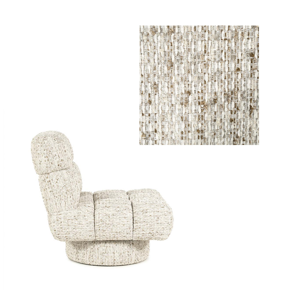 Specificaties: • Merk: Eleonora • Serie: Fenna • Kleur: Taupe / Beige • Afmetingen: H 83 × B 78 × D 83 cm • Materiaal: Stof Vive, metalen draaivoet • Zitting: Comfortabele, vaste zitting met afgeronde rug • Draaibaar: Ja, 360°