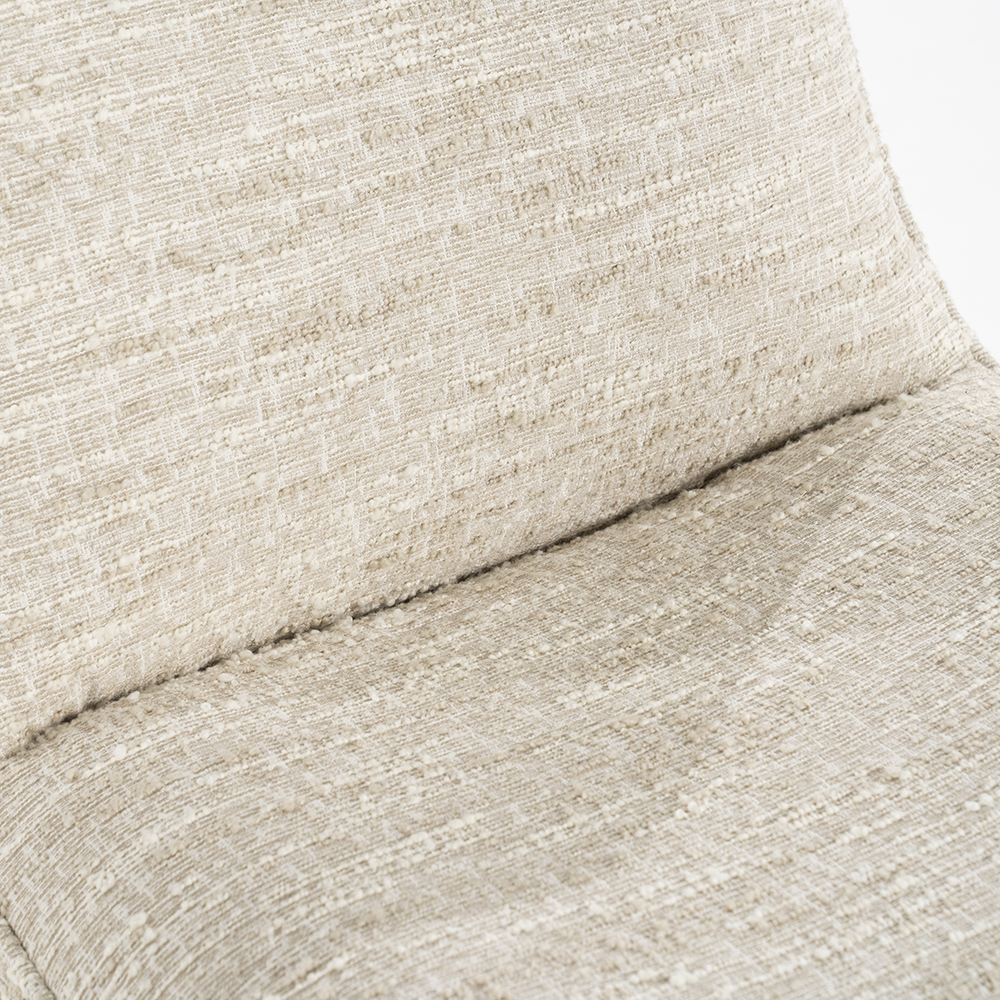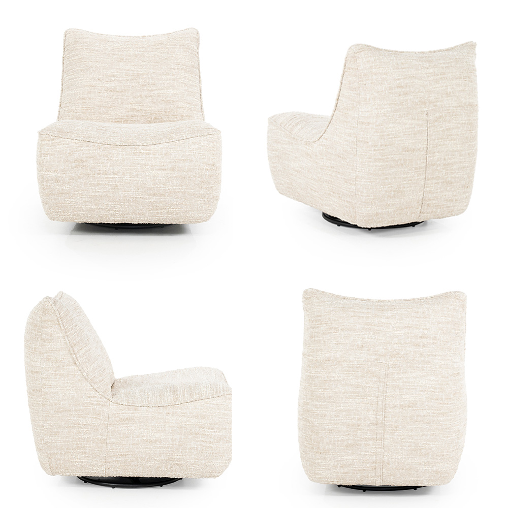 Deze fauteuil straalt comfort en stijl uit door het uitnodigende ontwerp en de zachte bekleding in een verfijnde beigekleur. Dankzij de draaibare voet biedt de stoel extra functionaliteit, waardoor je gemakkelijk naar iedere richting draait. De hoogwaardige stof heeft een fraaie textuur met subtiele reliëfdetails die zorgen voor een luxe uitstraling en een warme sfeer. Door zijn moderne, minimalistische vormgeving past deze fauteuil uitstekend in diverse interieurs, van hedendaags tot Scandinavisch of klassiek. Perfect om heerlijk te ontspannen, een boek te lezen of rustig te genieten van een moment voor jezelf