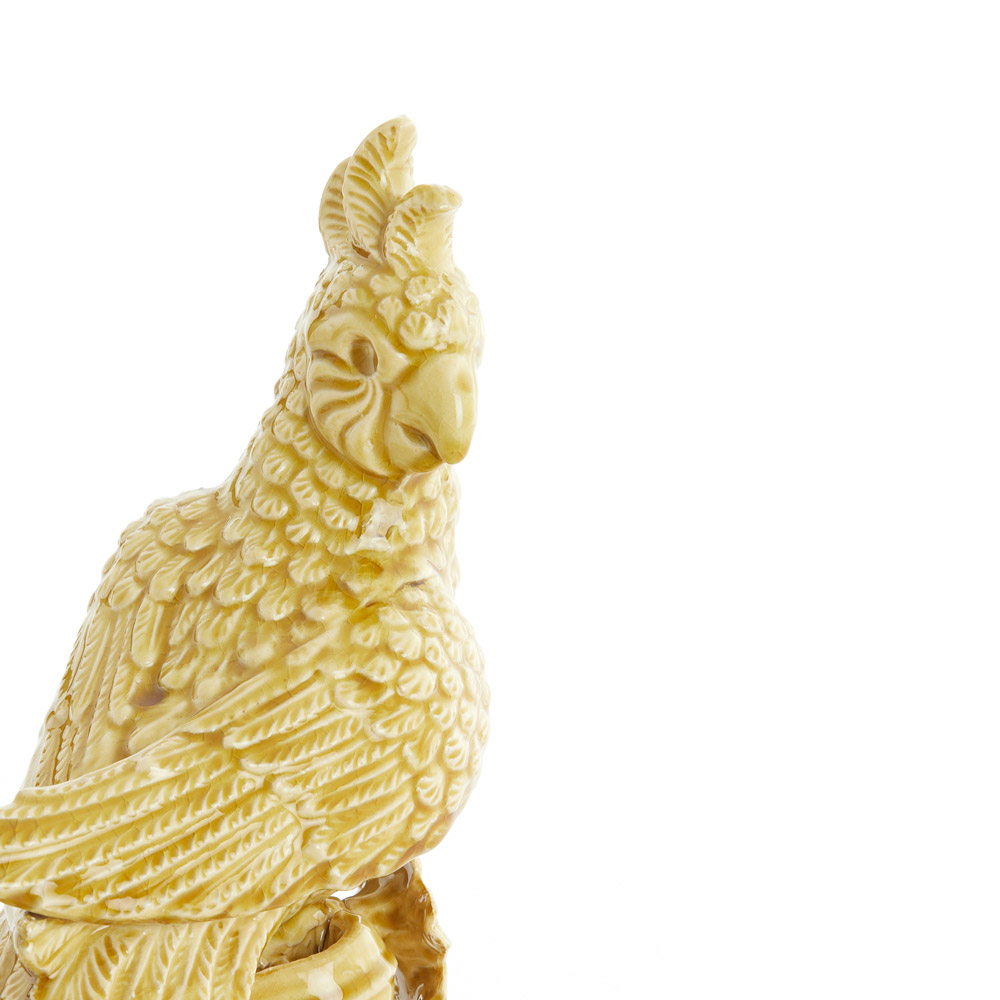 Een karaktervol keramieken vogelornament in een warme okergele tint. De rijke details en sierlijke vormen geven dit beeld een klassieke, bijna exotische uitstraling – perfect als opvallend accent op een dressoir, sidetable of in een open kast.