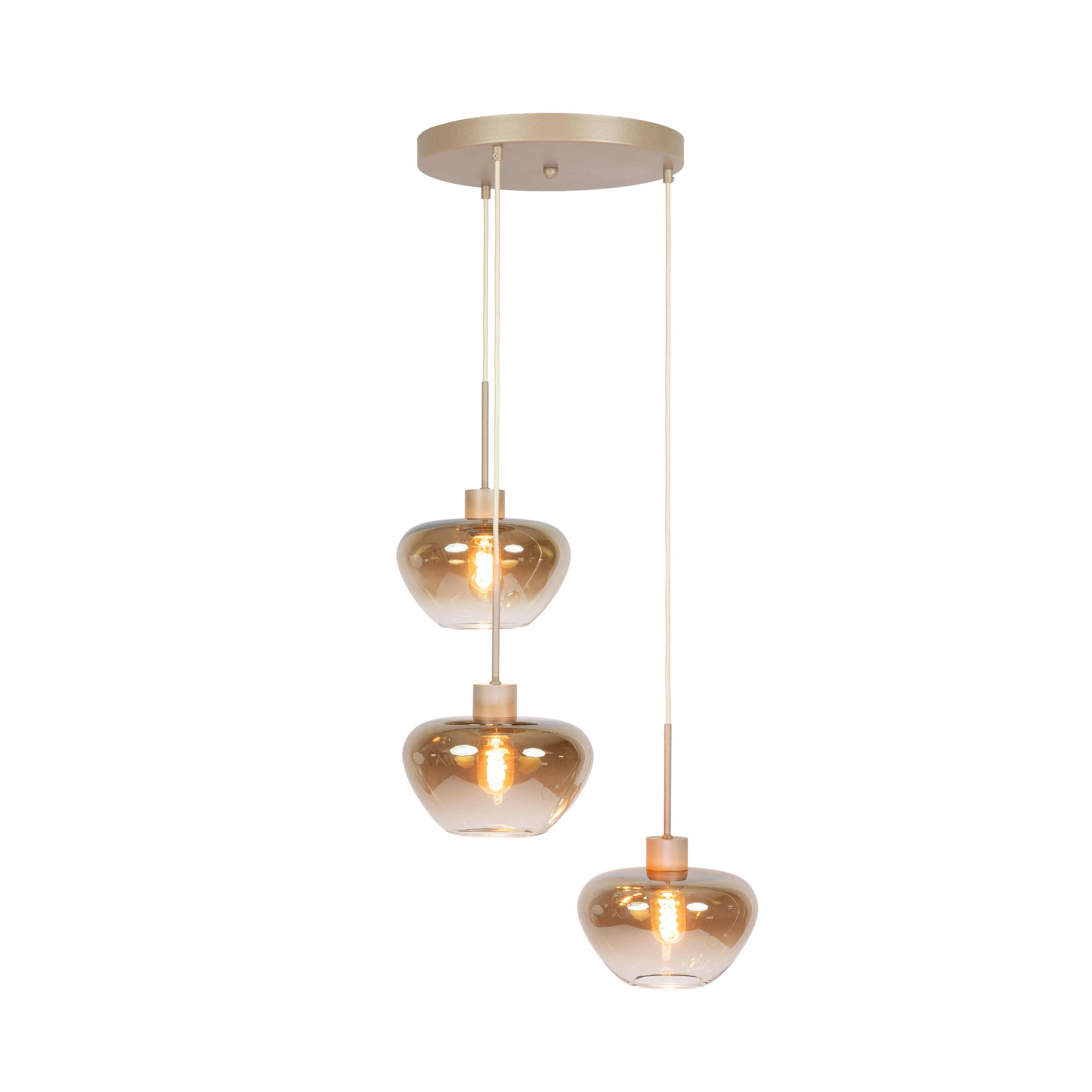 De Genua Rond 3L is de ronde variant uit de Genua-serie en ideaal wanneer je dezelfde luxe uitstraling zoekt, maar minder ruimte hebt. De drie amberkleurige glazen kappen hangen speels op verschillende hoogtes onder een compacte ronde plafondplaat. Dit zorgt voor een elegant, luchtig geheel dat schittert boven een kleine eettafel, in de hal of in een knusse zithoek.