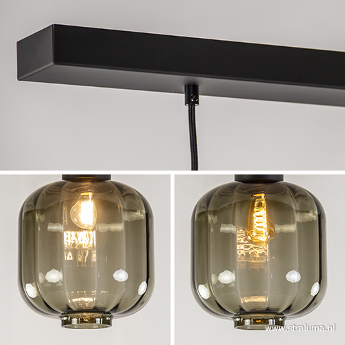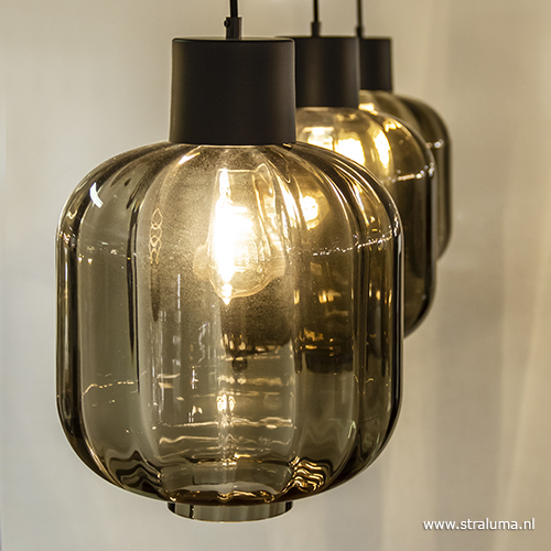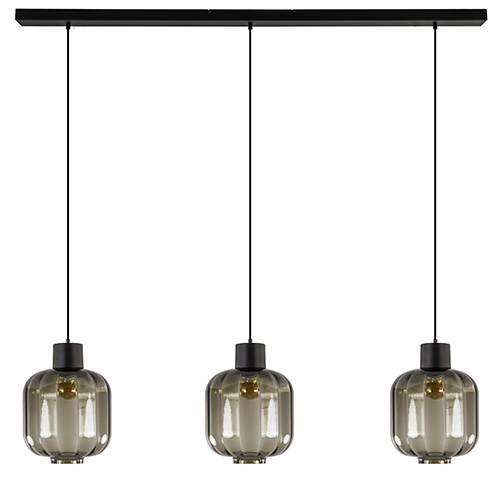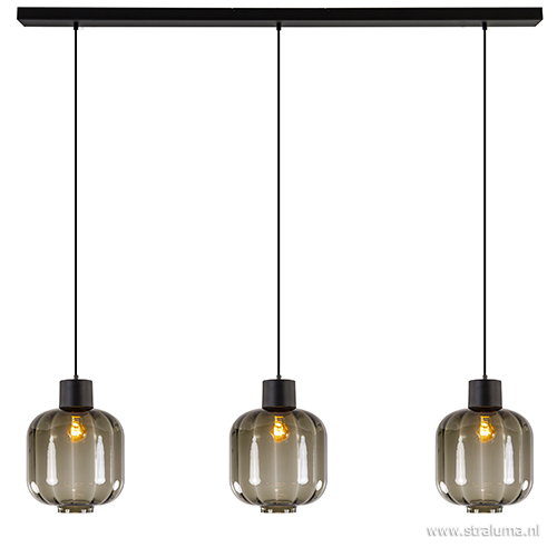 Deze luxe 3-lichts hanglamp is vervaardigd uit mondgeblazen glas uit Italië, wat resulteert in de hoogwaardige glazen kappen. Door het gebruik van grijs-zwart glas krijgt de hanglamp een extra luxe en sfeervolle uitstraling. De glazen kappen lopen over in een mat zwart metalen armatuur en hangen aan een zwart stofomwonden snoer die in hoogte is te verstellen. De luxe glazen hanglamp wordt aan het plafond bevestigd met een mat zwarte balk die het geheel compleet maakt. Deze eettafelhanglamp combineert mooi in een modern of strak-klassieke woonstijl.