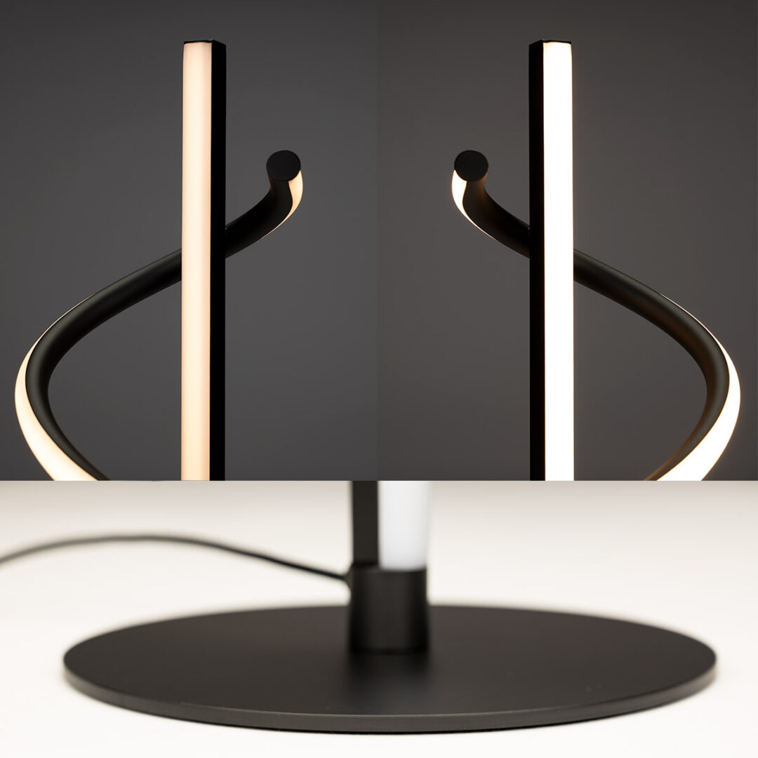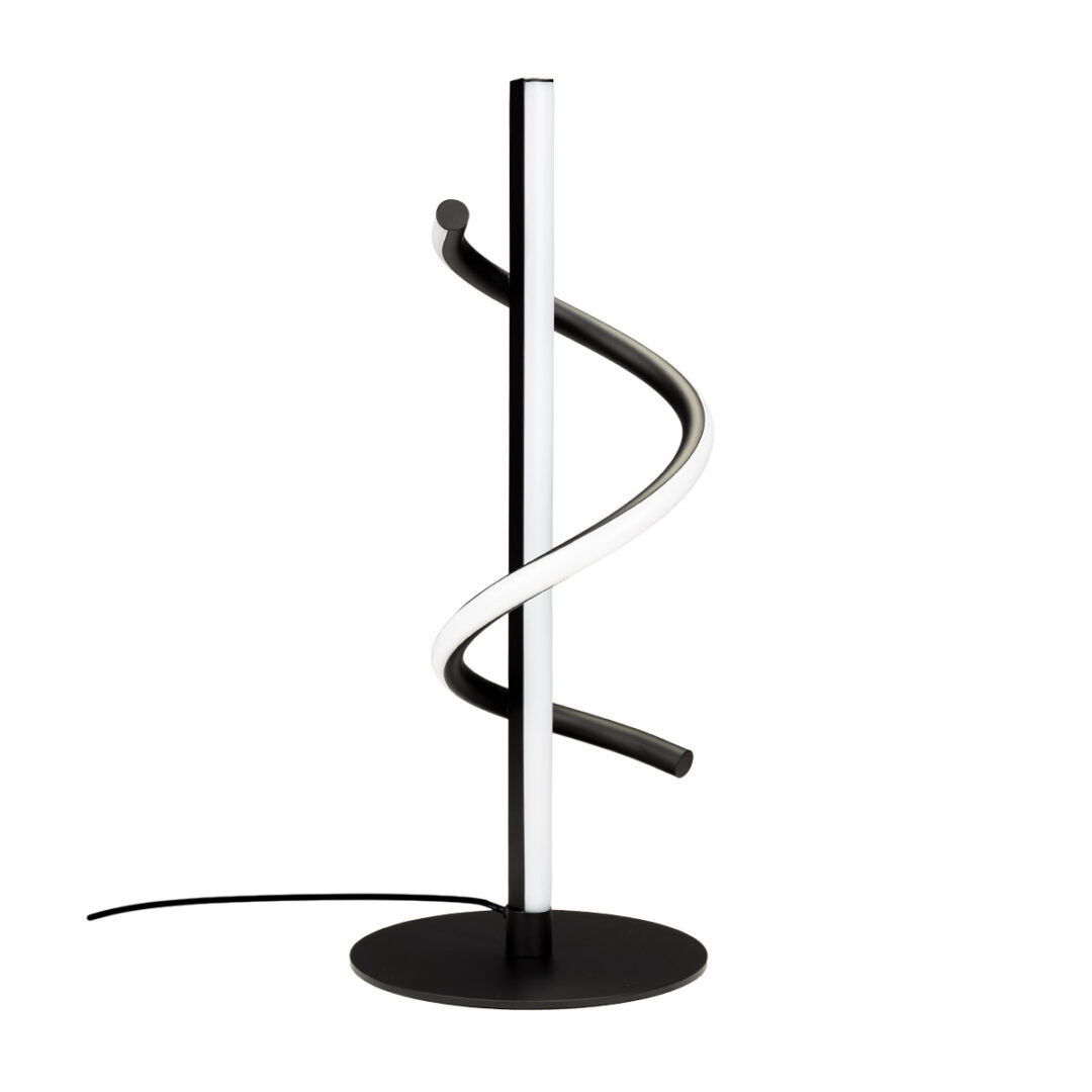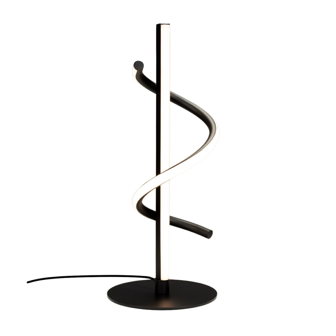 Highlights • Moderne tafellamp met grafisch, spiraalvormig ontwerp • Zwarte afwerking voor een krachtig contrast in het interieur • Geïntegreerde LED met warm wit licht (2700K) • 3-standen dimbaar voor eenvoudig schakelen tussen lichtniveaus