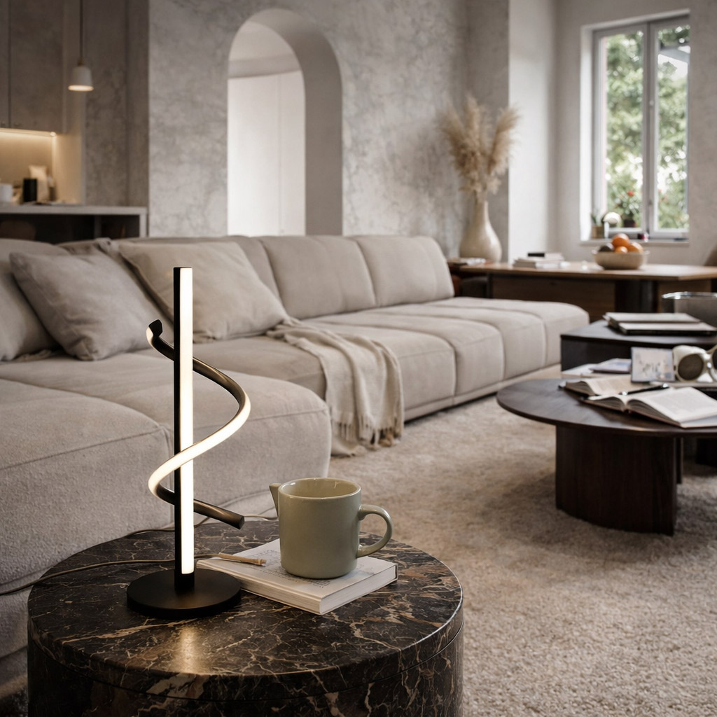 Deze zwarte LED tafellamp is een uitgesproken ontwerpobject voor op een dressoir, bureau of bijzettafel. De verticale vorm in combinatie met het spiraalvormige lichtaccent geeft de lamp een duidelijk grafisch karakter en maakt hem zowel functioneel als decoratief inzetbaar.