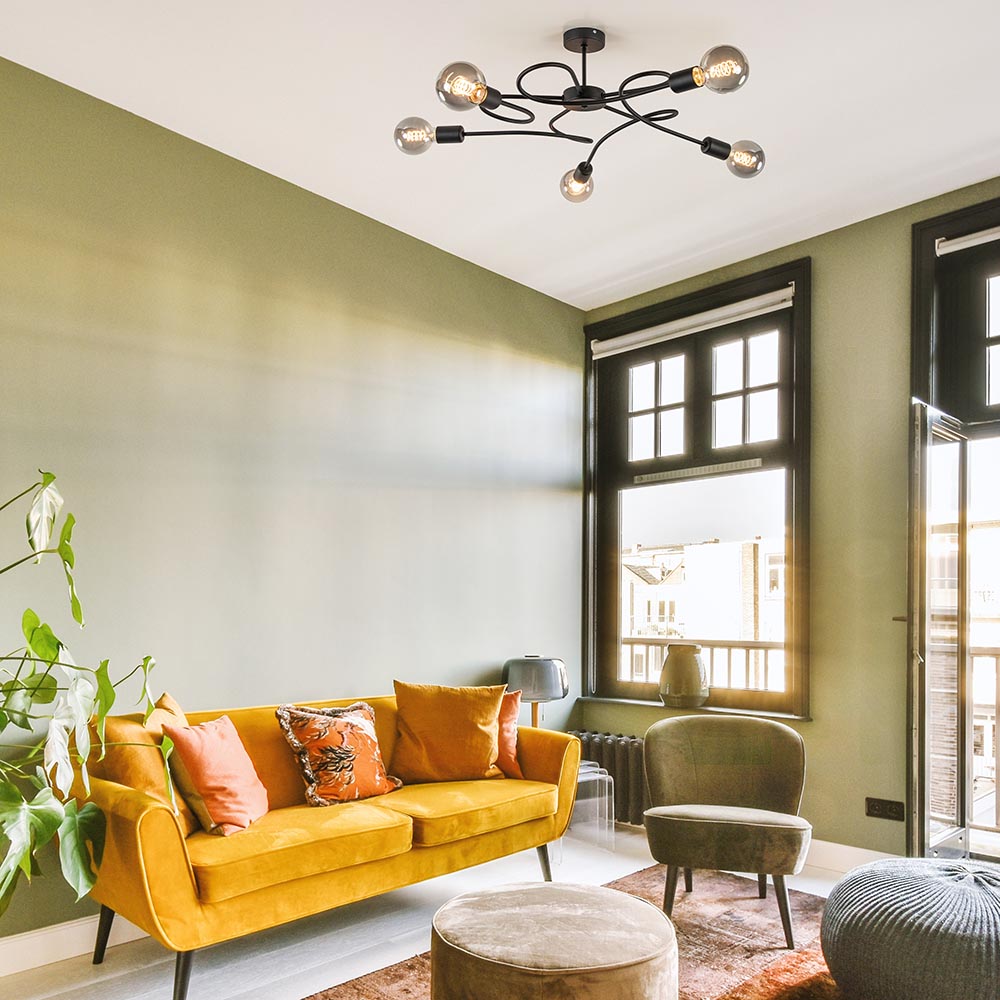 Een speelse plafondlamp met elegante lijnen. De armen van het armatuur zijn voorzien van een krul wat die retro/elegante look geeft aan de plafondlamp. Het armatuur is gemaakt van metaal en voorzien van een mat zwarte finish. De lichtbron is bepalend voor de sfeer van de lamp. Deze is exclusief. Zo kunt u zelf de ideale lichtbronnen kiezen die passen bij uw woonstijl. De mat zwarte 3-lichts plafondlamp is dimbaar middels een externe dimmer (exclusief) en is een mooie toevoeging aan een slaapkamer of woonkamer.
