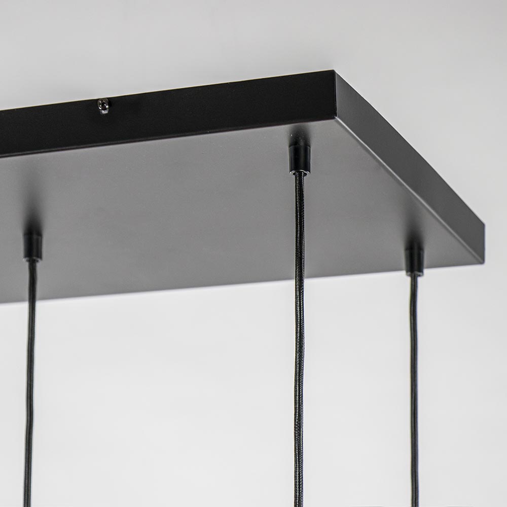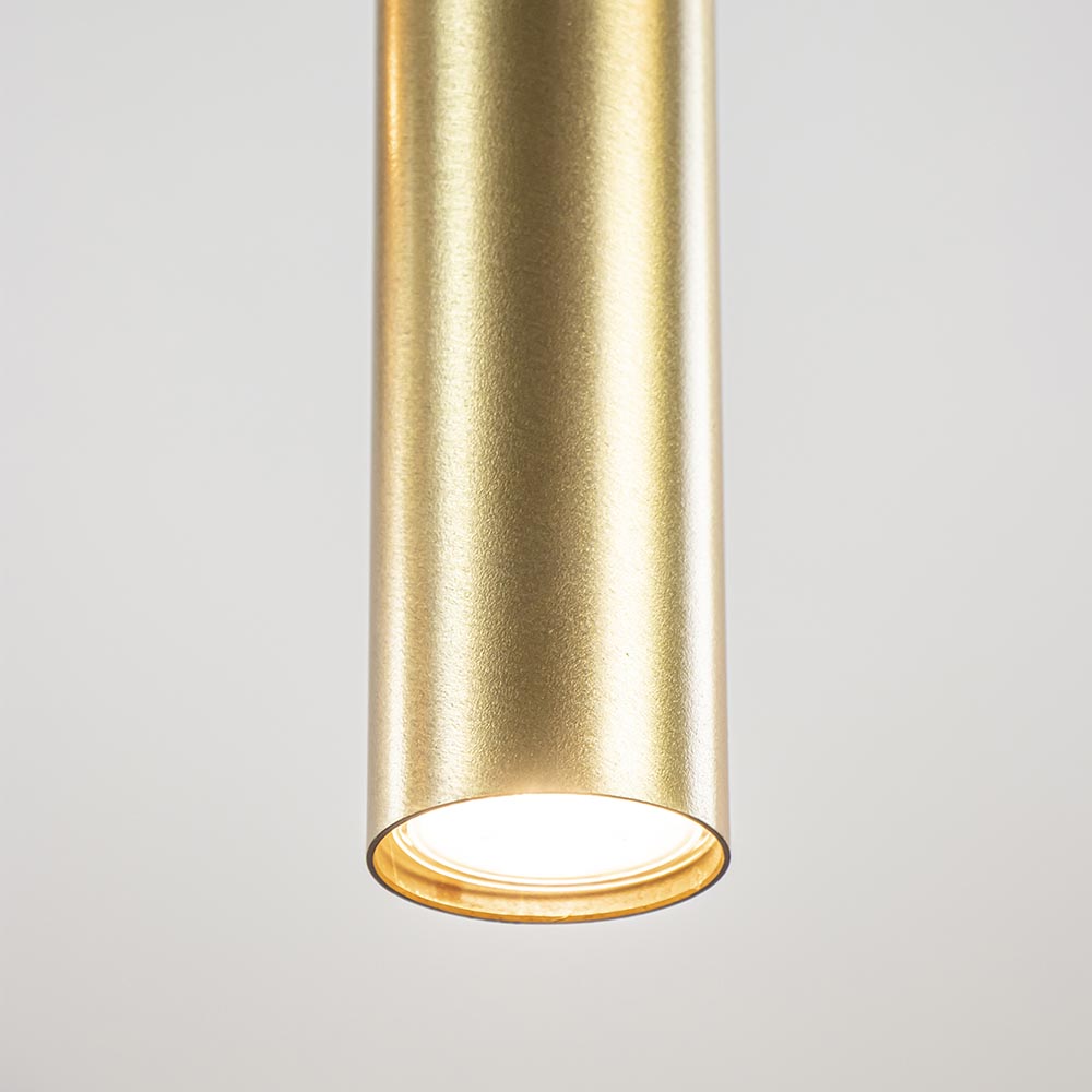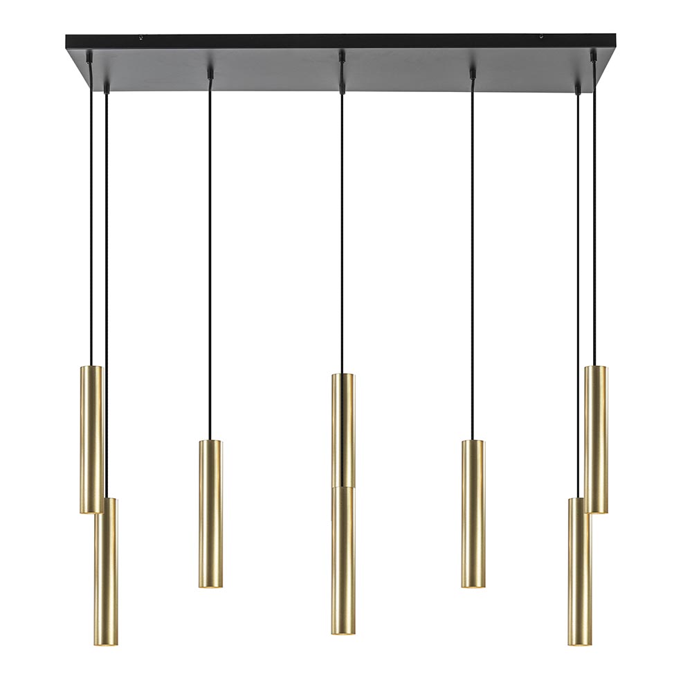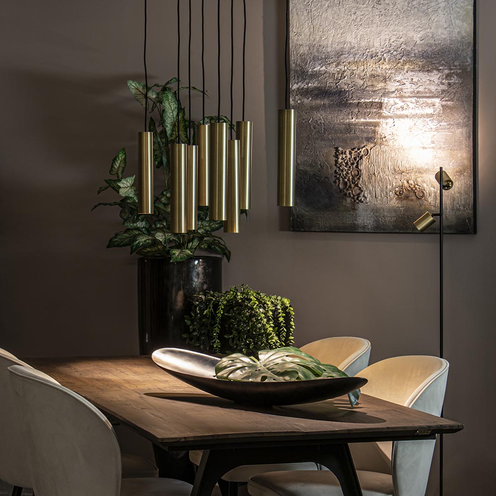 Een nieuwe trend die op diverse manieren wordt toegepast is de cilinder vormige kap. Veelal gecombineerd met andere soorten kappen, maar nu ook verkrijgbaar als 8-lichts eettafelhanglamp. Deze grote hanglamp wordt bevestigd met een plafondplaat van 110×30 cm waar evenredig de 8 lichtpunten op zijn verdeeld. Ieder punt is voorzien van een metalen cilinder vormige kap die is uitgevoerd in het goud. De kappen zijn allemaal naar wens op hoogte te hangen om zo een mooie speelse verdeling in de lamp te creëren. Doordat de cilinders vooral werken als downlighter wordt het oppervlak onder de lamp goed uitgelicht. Hoe hoger de cilinders hangen, hoe breder het oppervlak onder de lamp wordt uitgelicht. De lichbron is ook in de cilinder in hoogte te verstellen. Een prachtige lamp voor boven de eettafel of het kookeiland. De grote 8-lichts hanglamp cilinders is dimbaar middels een externe dimmer (exclusief).