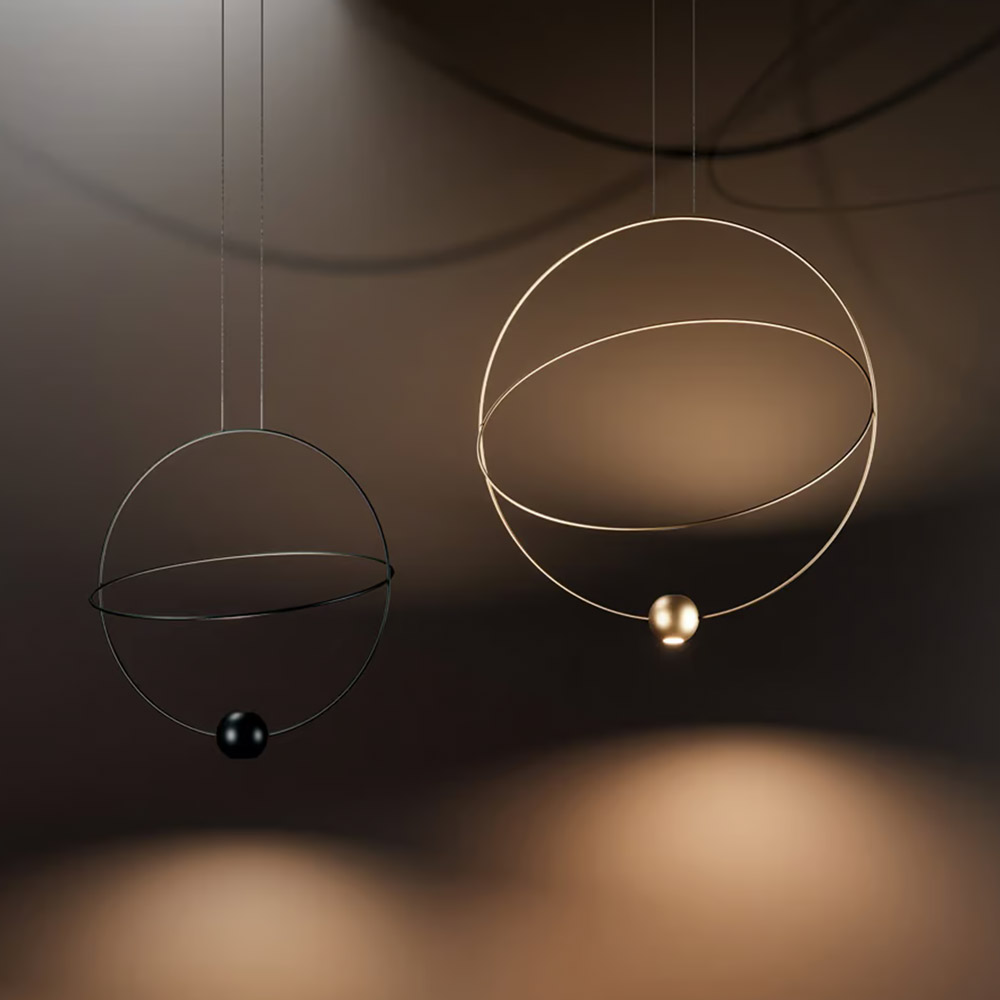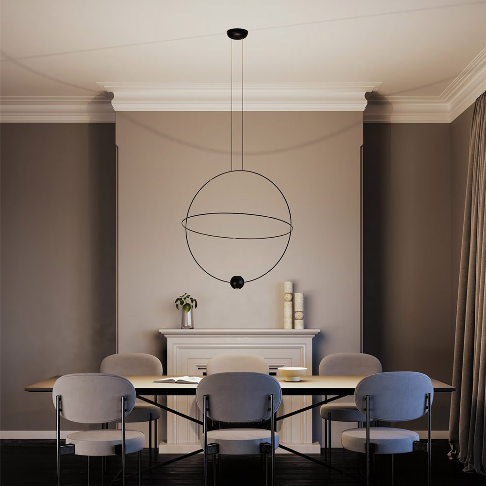 Deze indrukwekkende design hanglamp is een echte blikvanger voor wie durft te kiezen voor uitgesproken vormgeving. Het minimalistische ontwerp is geïnspireerd op de beweging van planeten en bestaat uit een grote, vaste ring gecombineerd met een kleinere, verstelbare ring. Dit zorgt voor een dynamisch en evenwichtig lijnenspel dat perfect tot zijn recht komt boven een grote eettafel, in een hoge hal of vide, of als statement in een hotel lobby of kantoorruimte.